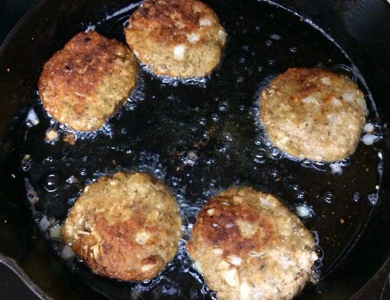 Mix all ingredients well and form into patties. I usually let it set up in the refrigerator for an hour before making patties.Heat about a cup or so vegetable or canola oil in a cast iron skillet on medium-high heat until heat. Fry patties (I do four or five at a time) for 5-7 minutes on each side or until nice and brown.