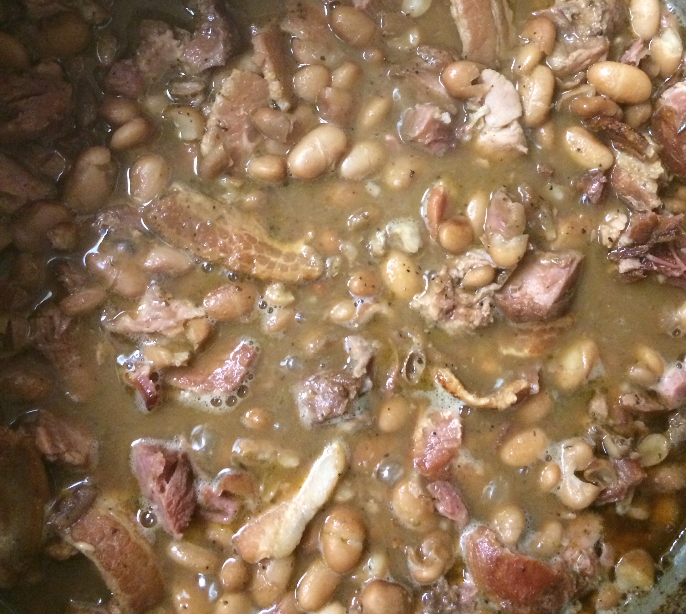 Rinse beans thoroughly in a colander. Put into large pot and add broth, ham bone and spices. Fill the pot with enough water to cover beans about 4-5 inches. Bring to boil, then reduce heat to simmer for a good 3 hours or until beans start to break open and get soft. If beans soak up a lot of the water, add more to pot. Remove bone and let cool. Pull any ham pieces off bone and chop. Put ham pieces back in pot and add crumbled bacon. Let simmer another hour or so.
