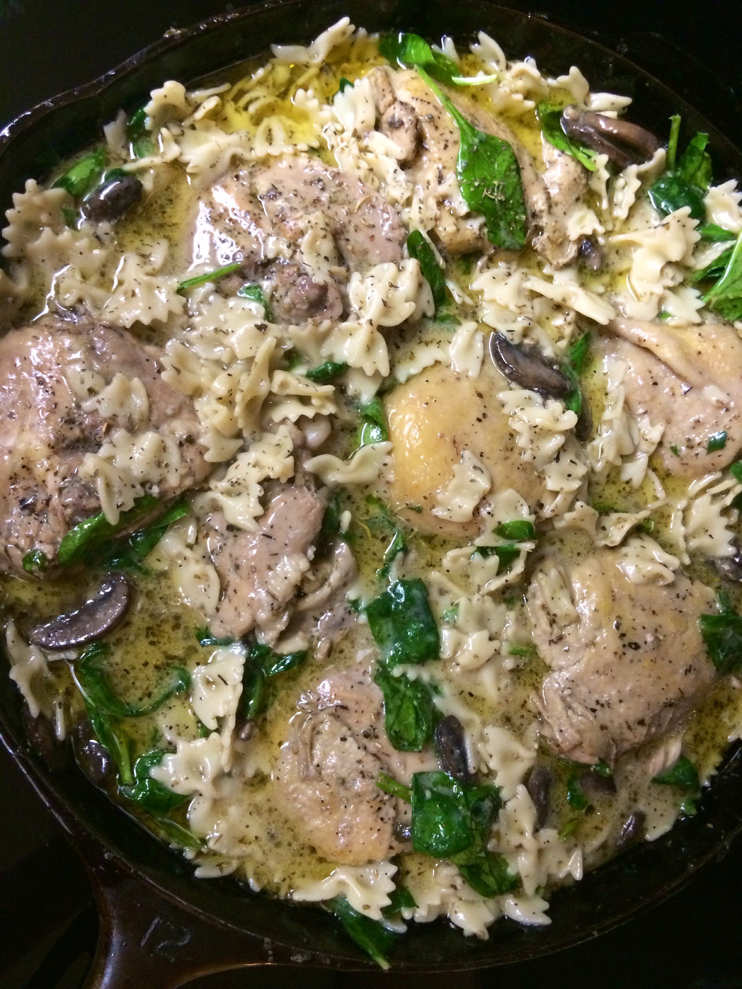 When chicken and sauce are done, remove from heat. Stir in baby spinach. Mix until spinach is wilted, only a few minutes. Blend pasta in. Serve with crusty bread.