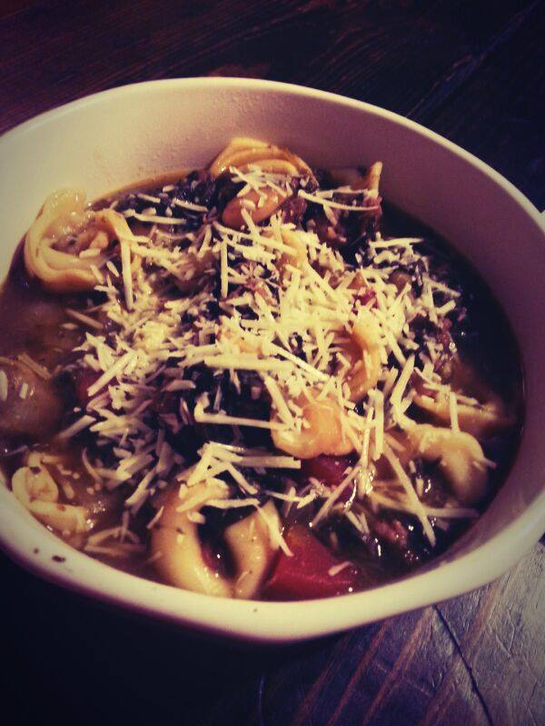 Cook on Medium Heat for 30 minutes, stirring occasionally. Add Tortellini and cook for 10 more minutes. Optional – You can add cubed cream cheese to make the stock creamy if desired. Serve with Parmesan on top.