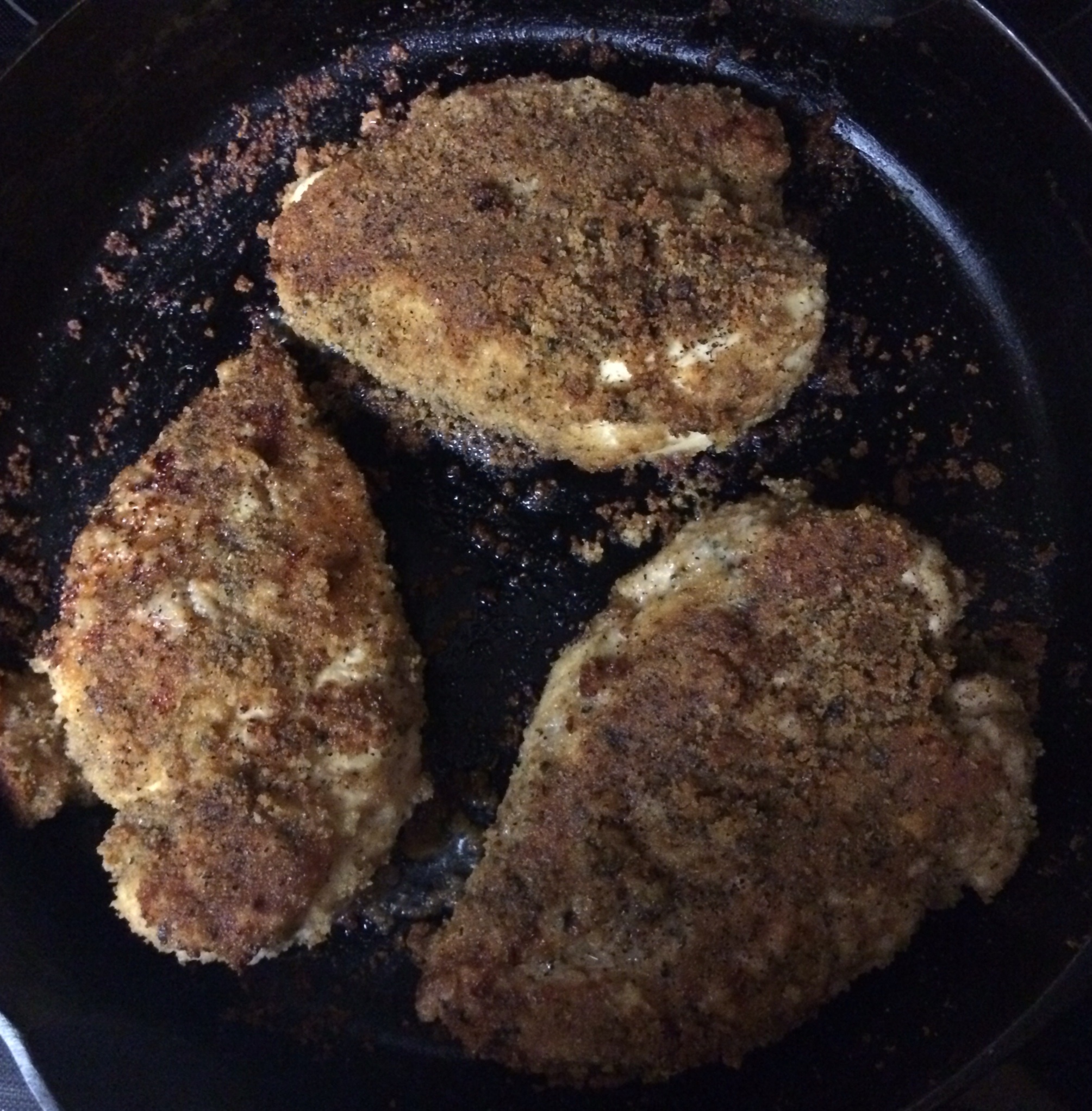 One at a time, dredge chicken breasts in mix and press mixture firmly on each side, generously. Place in casserole or skillet.