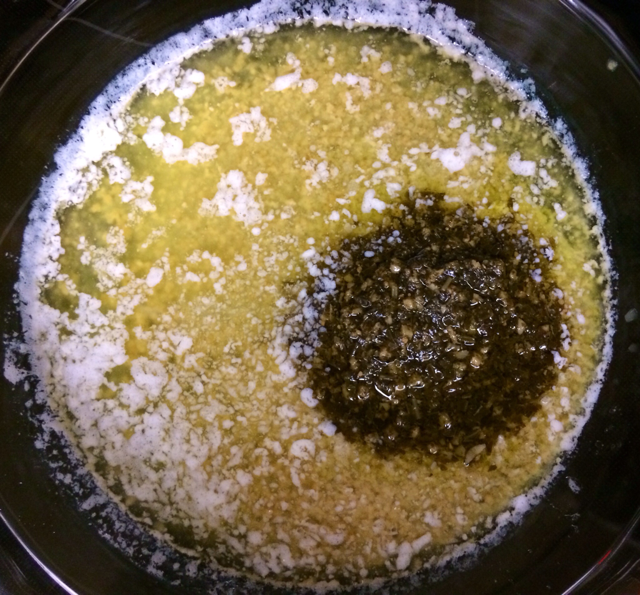 Melt butter in a dish large enough to accompany the chicken breasts. Add garlic and pesto.