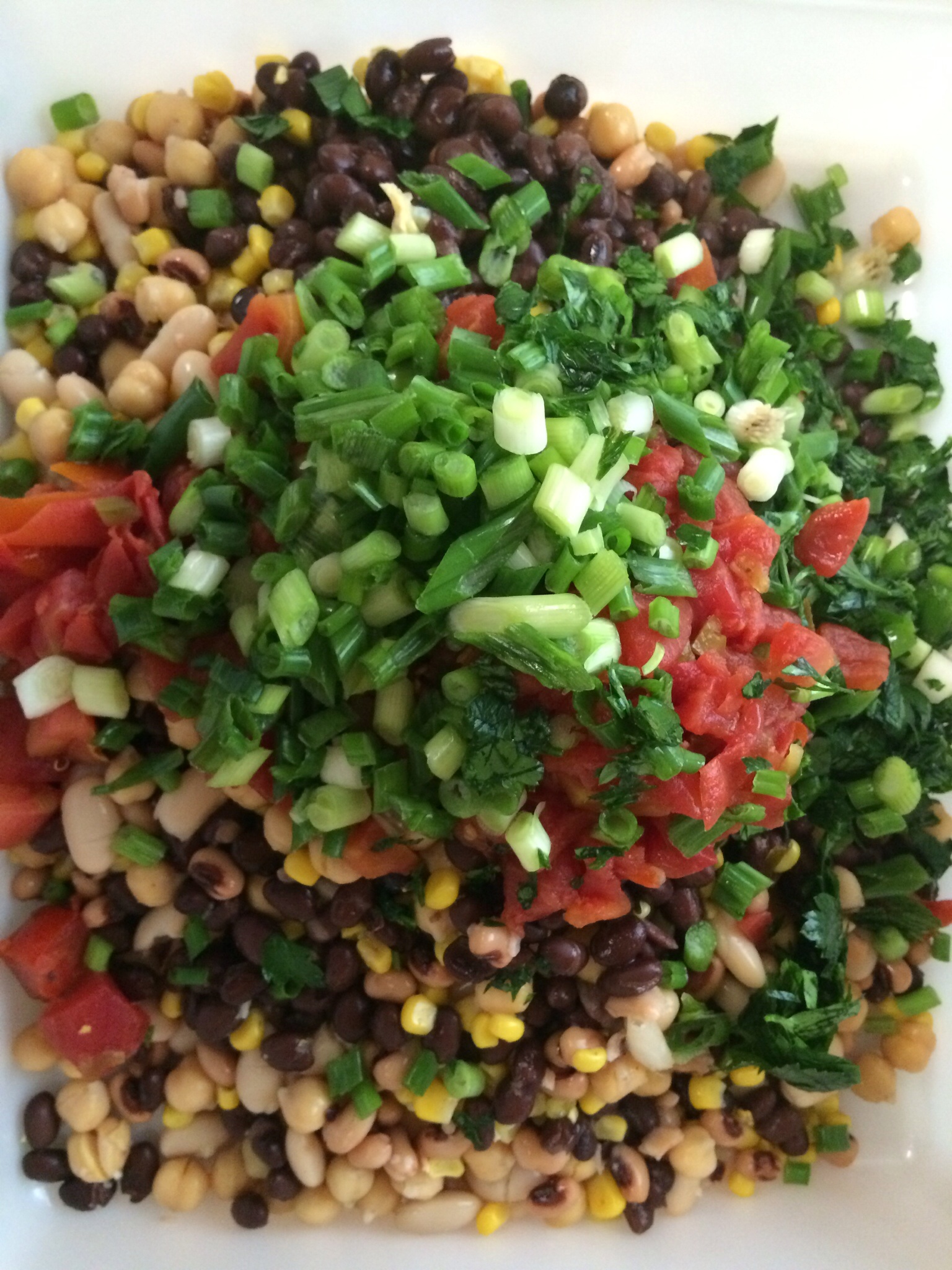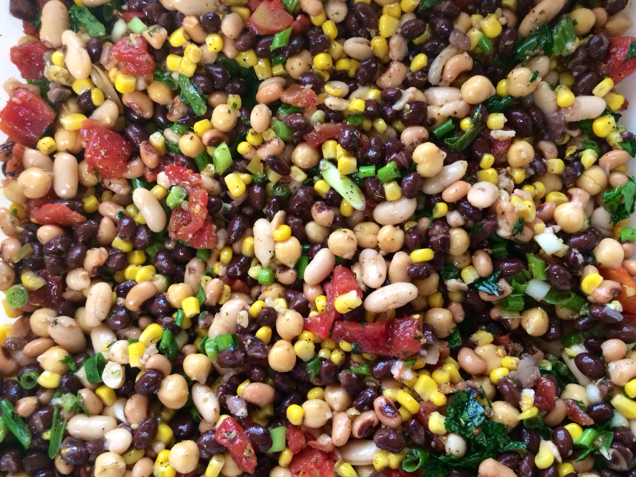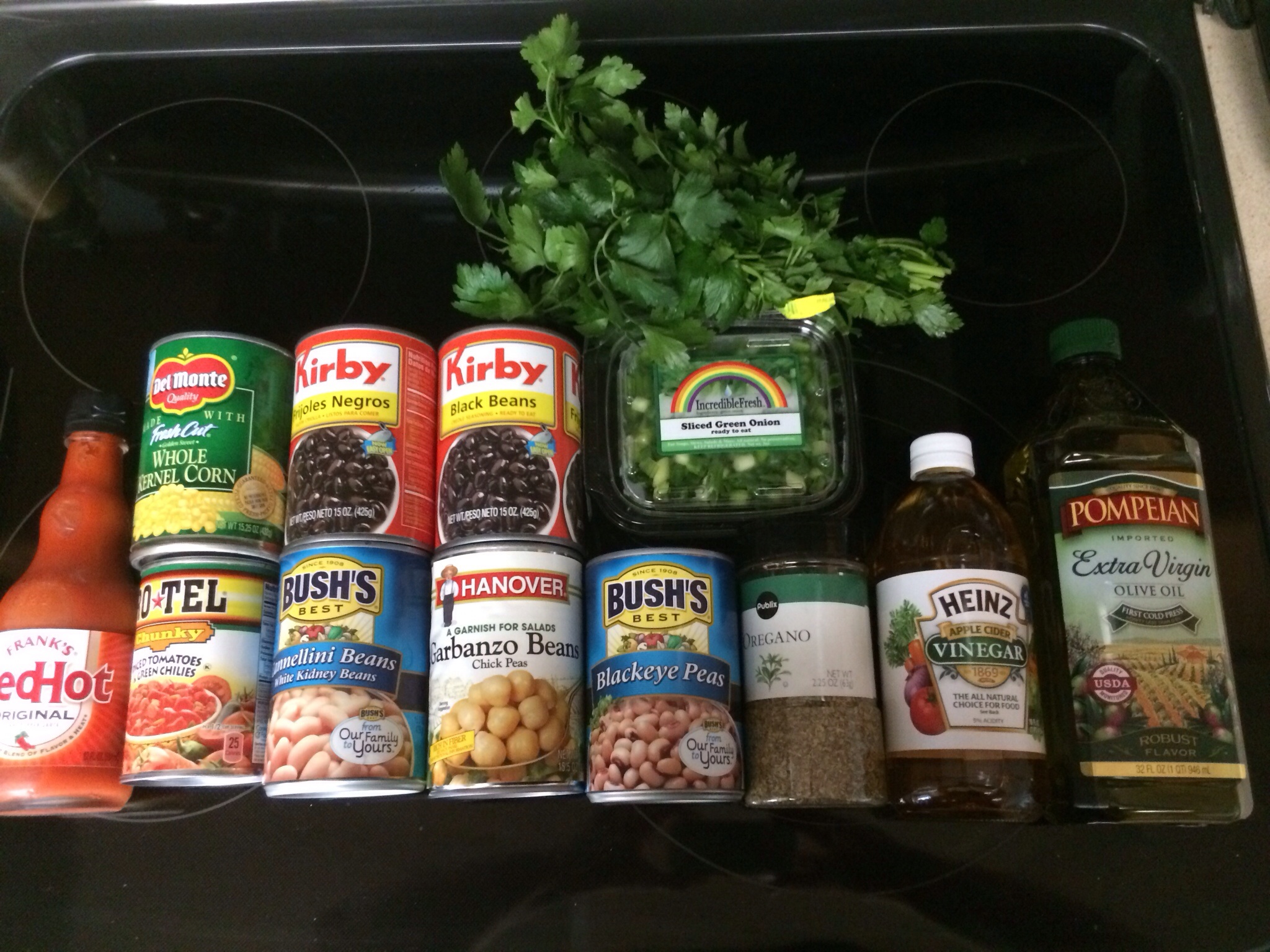 Rinse all beans and corn in a colander in sink. Let drain a few minutes. Add to a large bowl. Open Rotel tomatoes and drain, slightly. Add green onions and parsley.