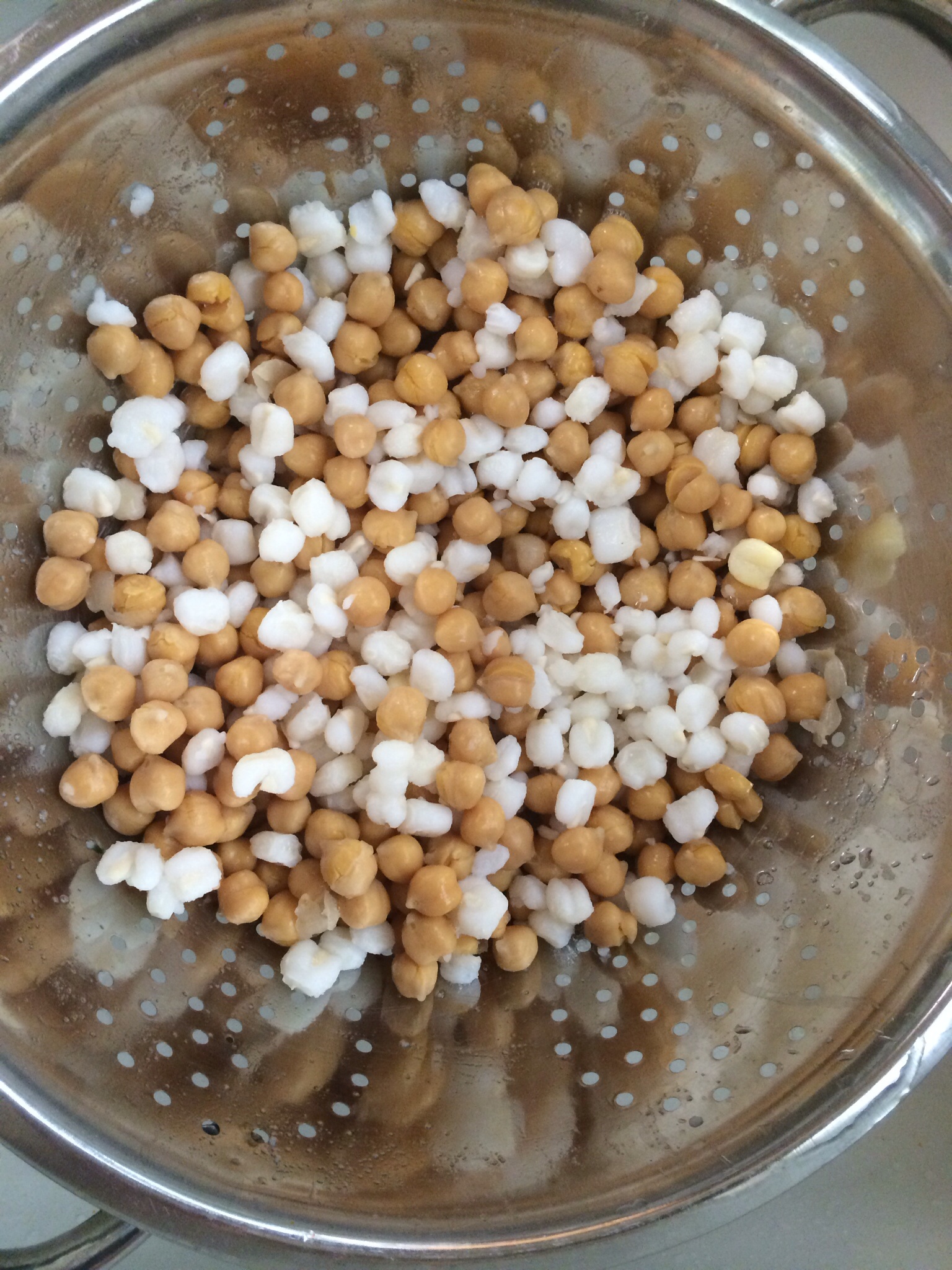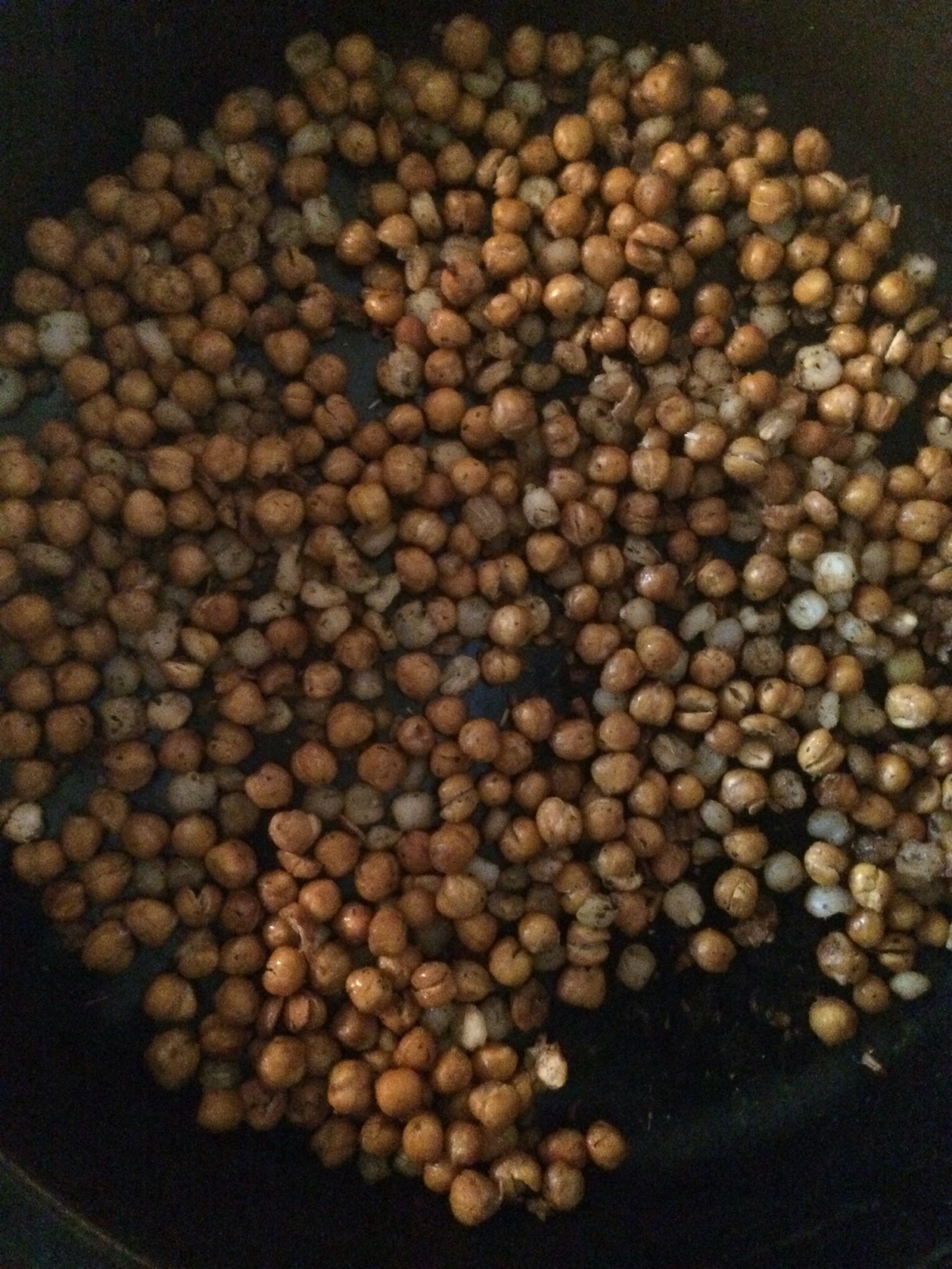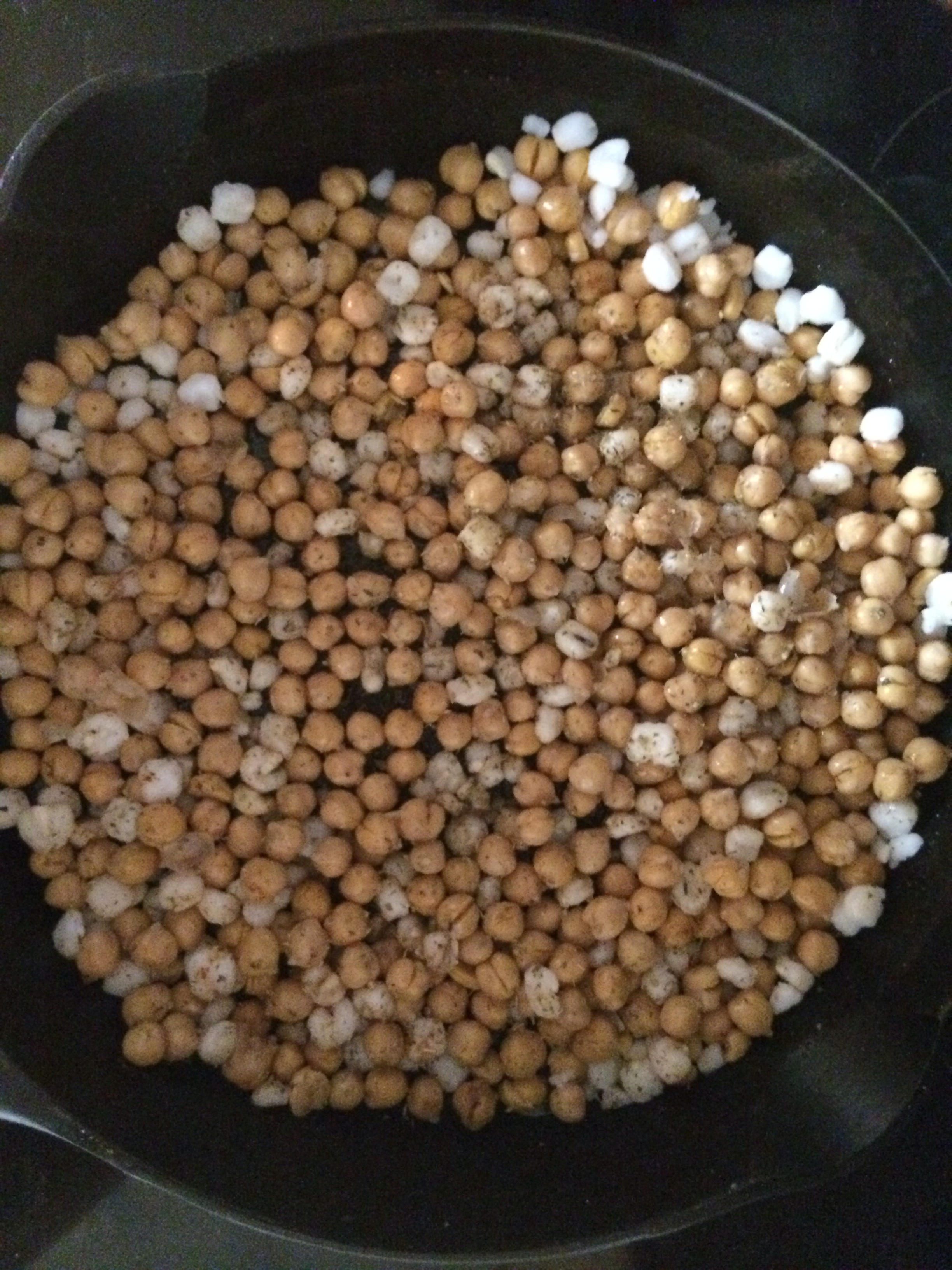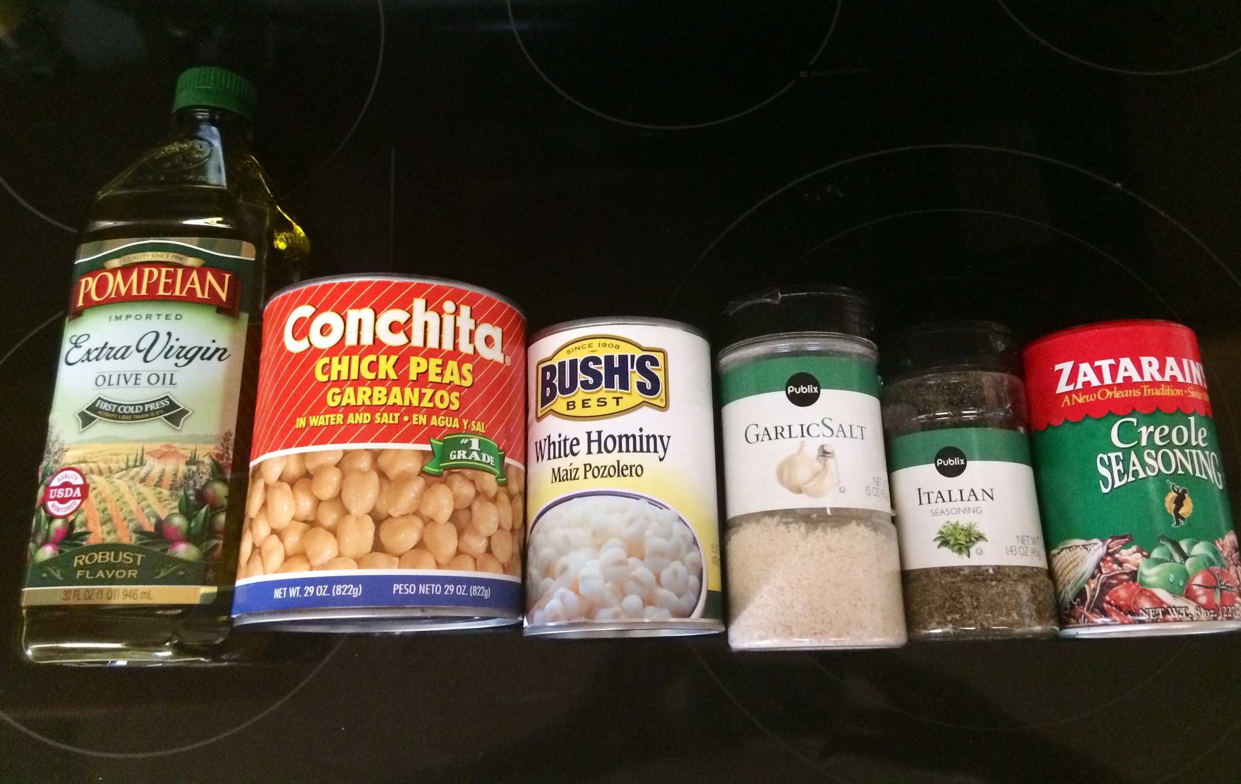 Pour chick peas and hominy onto a baking sheet or large cast iron skillet. Add olive oil and all spices. Mix well.