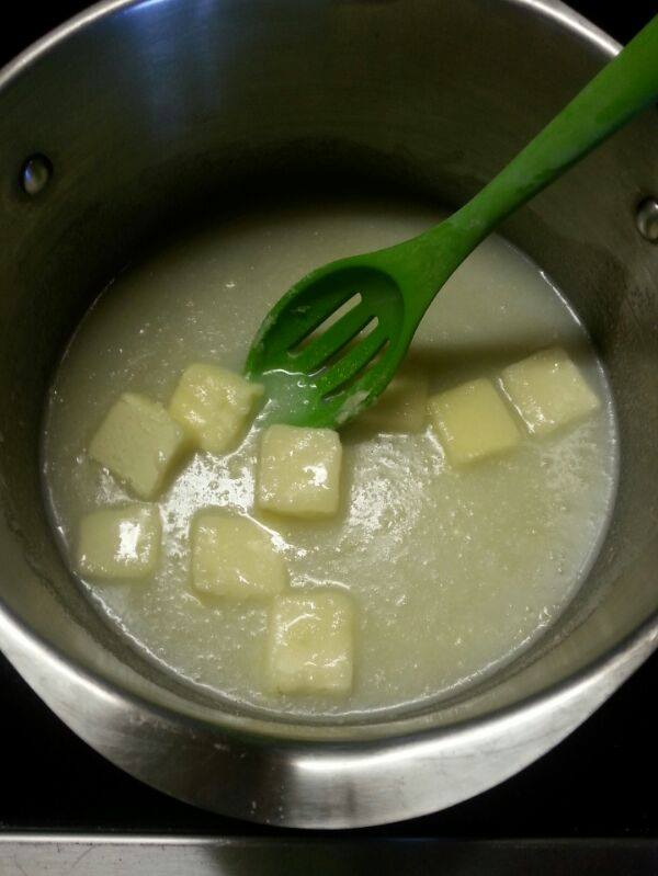 In a heavy medium-size saucepan, combine the sugar, milk, and butter over Medium Heat – very important to cut up the Butter so it melts quicker. Stir constantly.