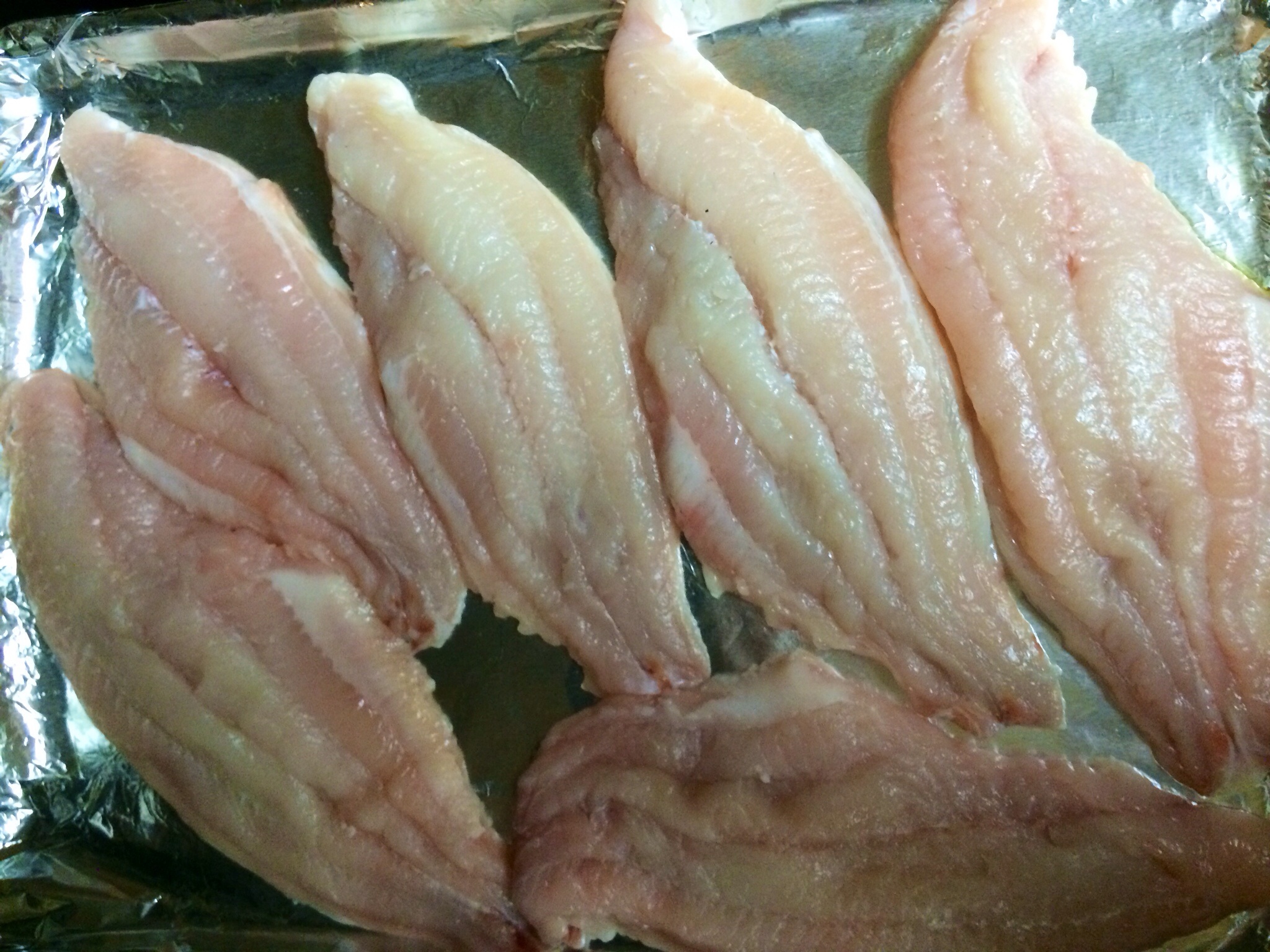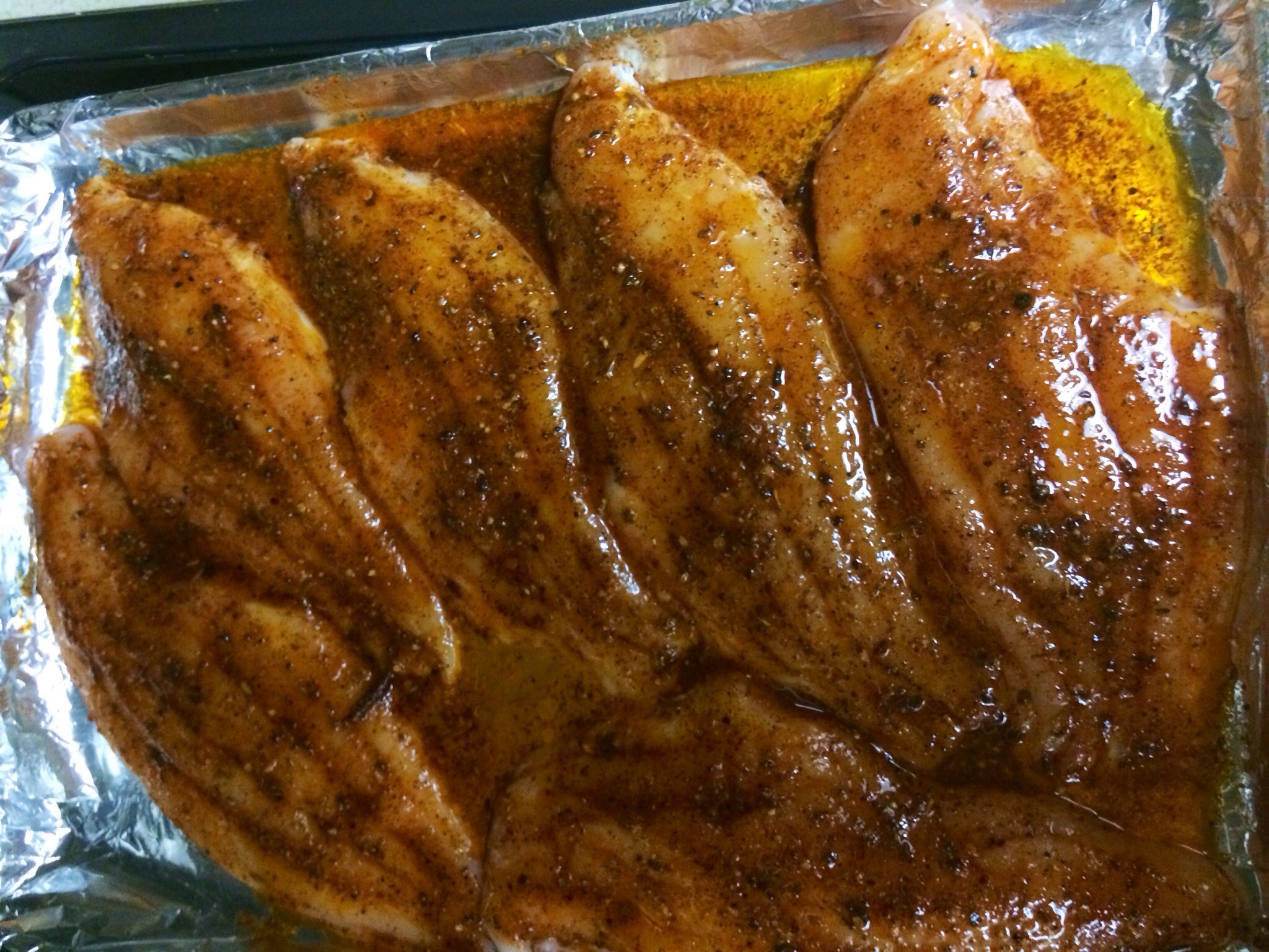 Cover a cookie sheet with aluminum foil. Pour 1 Tb olive oil over foil and spread out, using a paper towel, to distribute over surface. Arrange fish on cookie sheet.