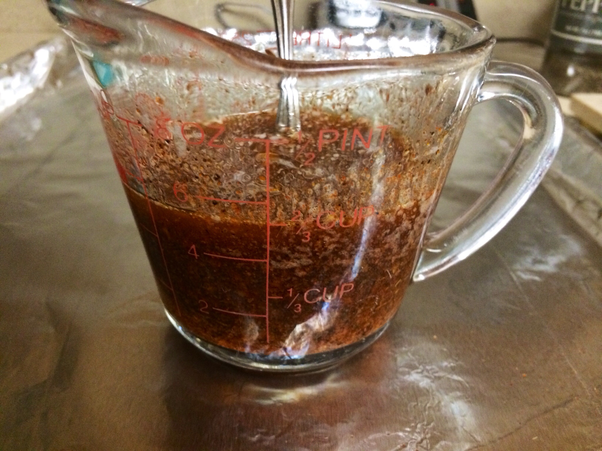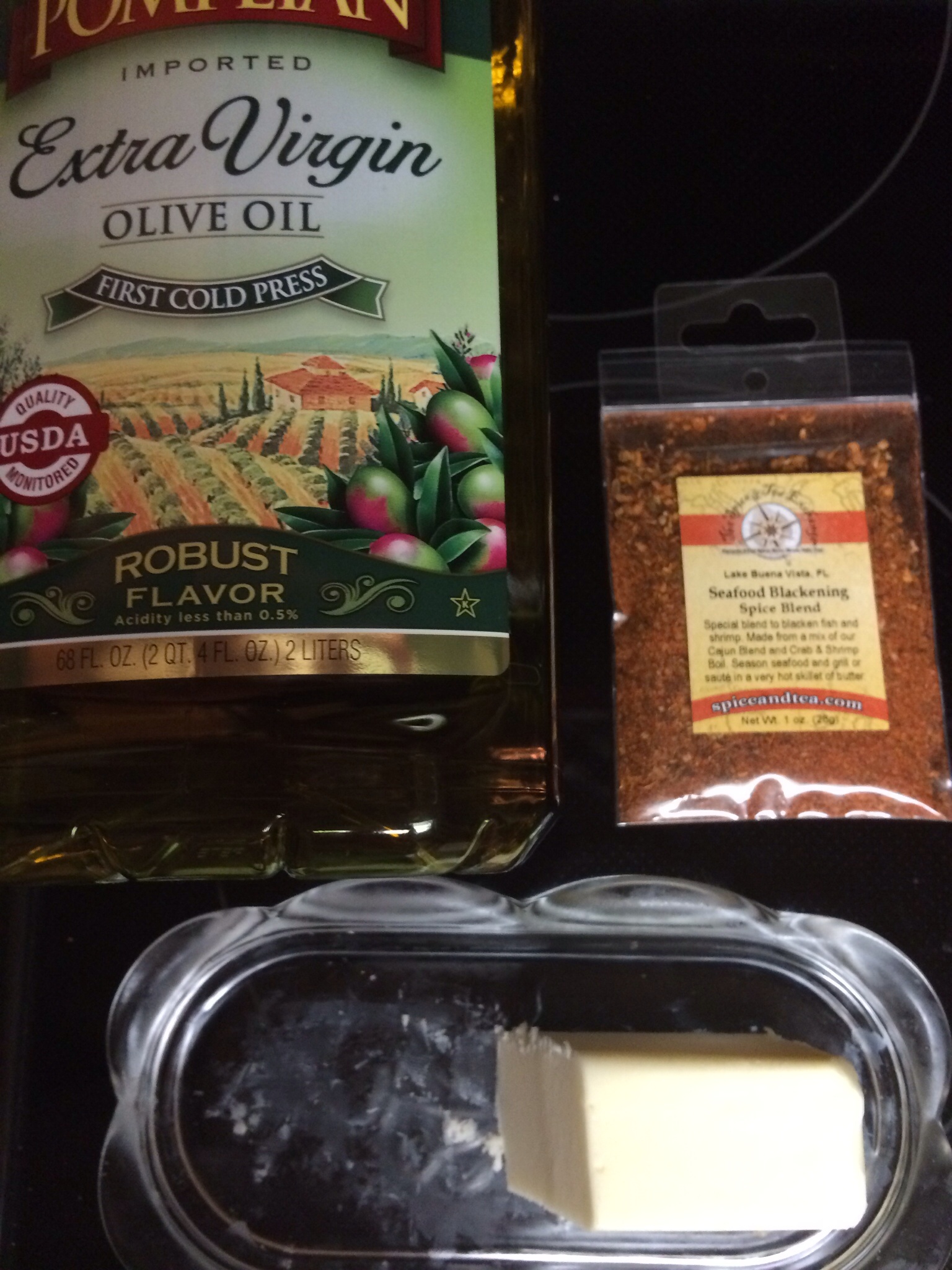 Melt butter. Add 1/4 cup olive oil and blackening spice. Mix well.