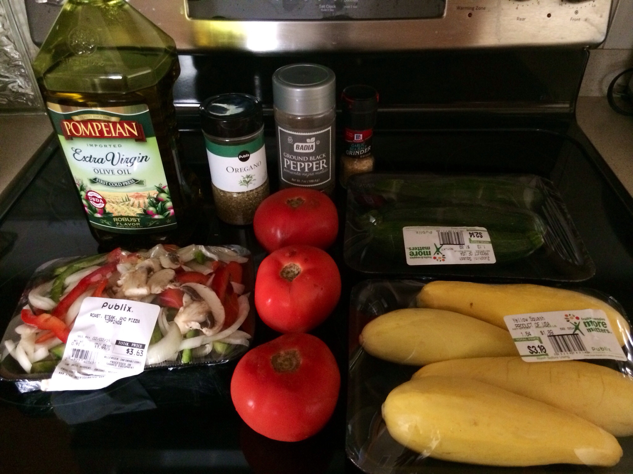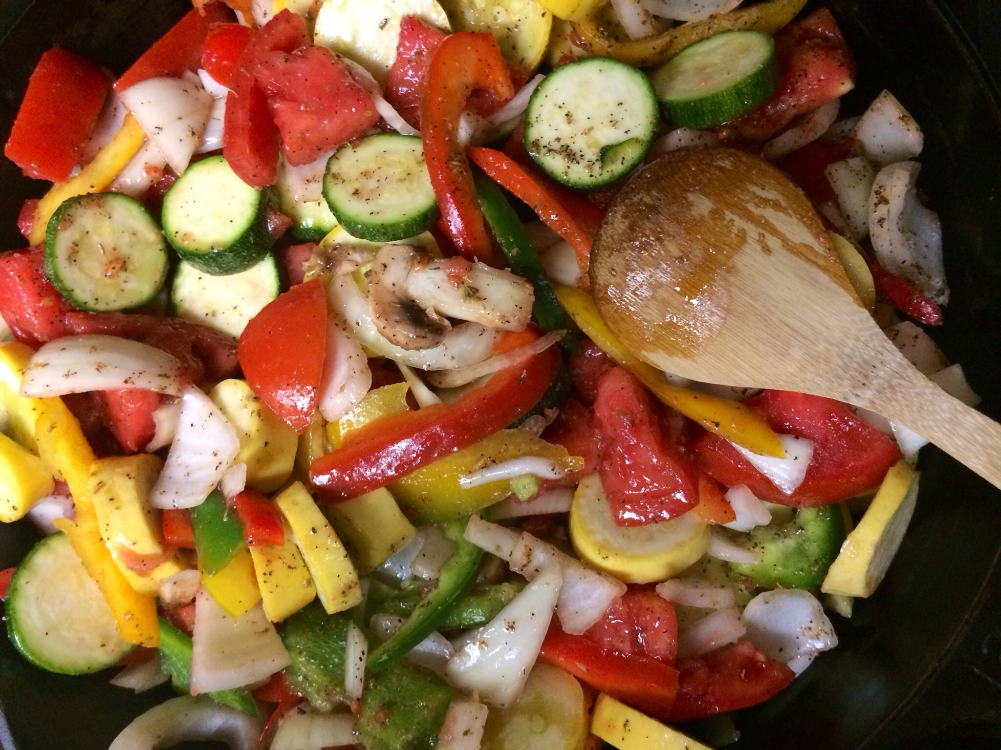 Assorted vegetables such as green pepper, red pepper, yellow pepper, zucchini, yellow squash and onion, cut up