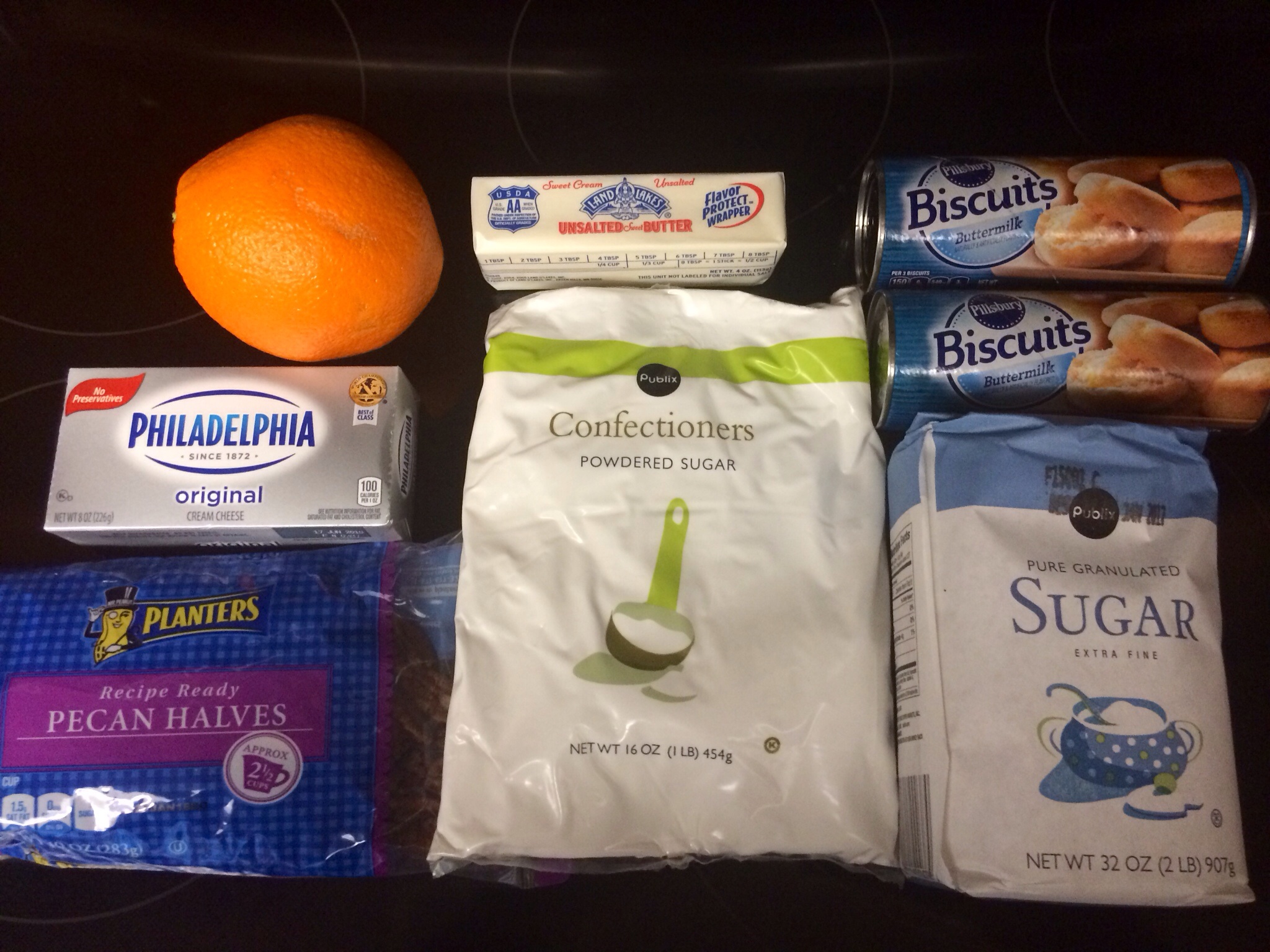 Set up prep area. Separate biscuits from can. Slice block of cream cheese in half lengthwise, then crosswise ten times until into 20 squares. Place one square of cream cheese into the middle of each biscuit. Fold in half and press edges to seal. Dip into butter and then into sugar/nut/orange mixture. Coat well.
