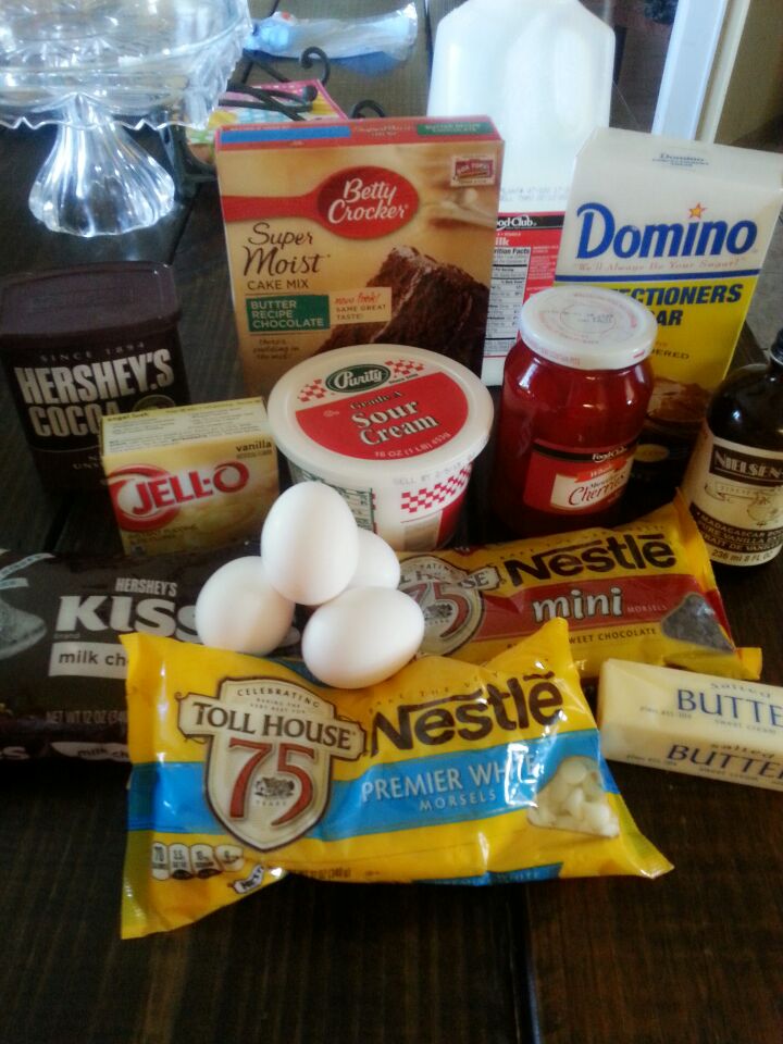 I came up with this Bundt cake with one of my favorite methods of using Pudding, Sour Cream and Milk in a Butter based Cake Mix. Then I added Mini Milk Chocolate Morsels and that results in a cake so moist and chocolaty that you don’t even have to add frosting or a glaze, but then of course we will add a glaze…….and Kisses…..or Cherries……or Oreos! I cut the cake in thirds to show three ways to top your cake! Choose one, two or all three ways like I did! And O my it turned out so decadent and lovely…….perfect for ANY occasion!