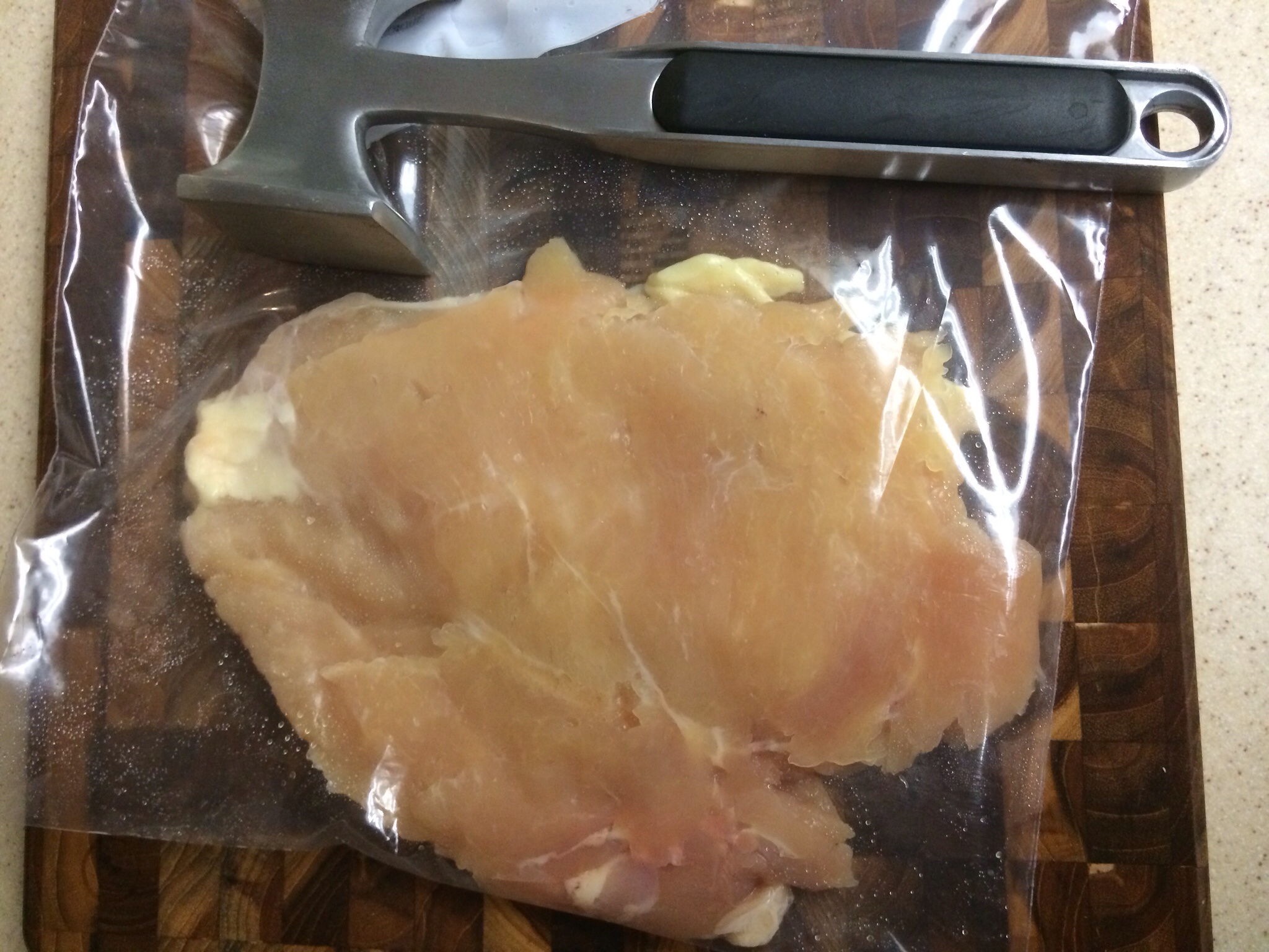 Pound chicken breasts, one at a time, in a plastic zip-lock bag until 1/4″ thickness. Move to plate.