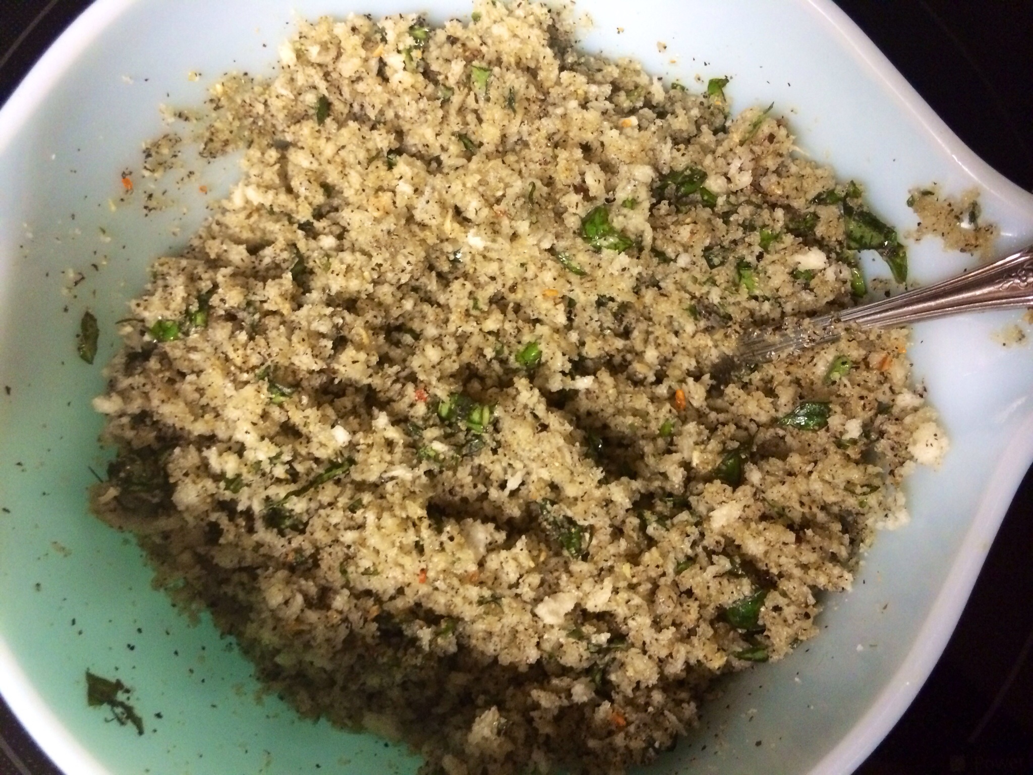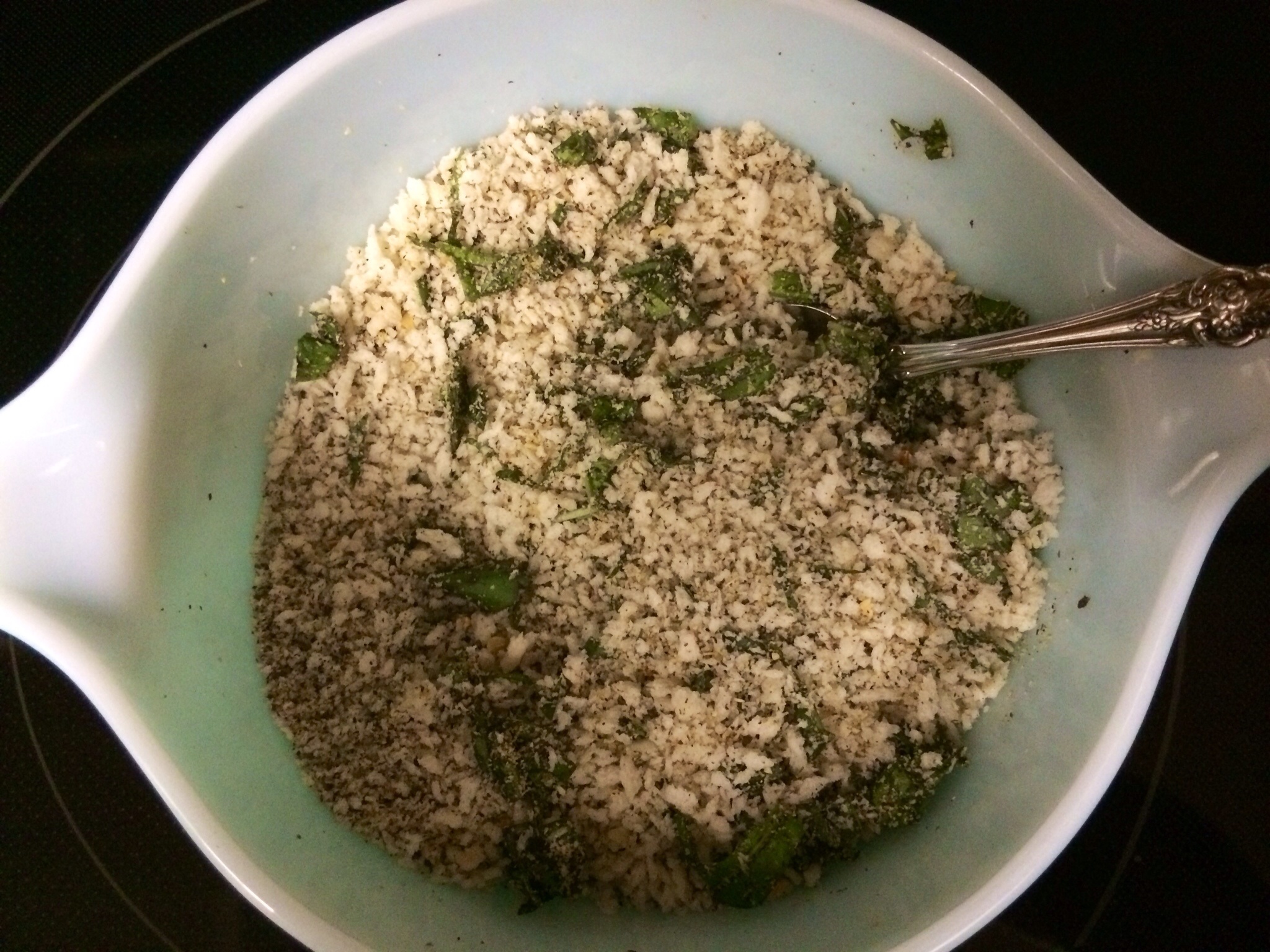 In a small mixing bowl, combine Panko, Mrs. Dash’s Garlic & Herb seasoning, and chopped basil. Mix well.