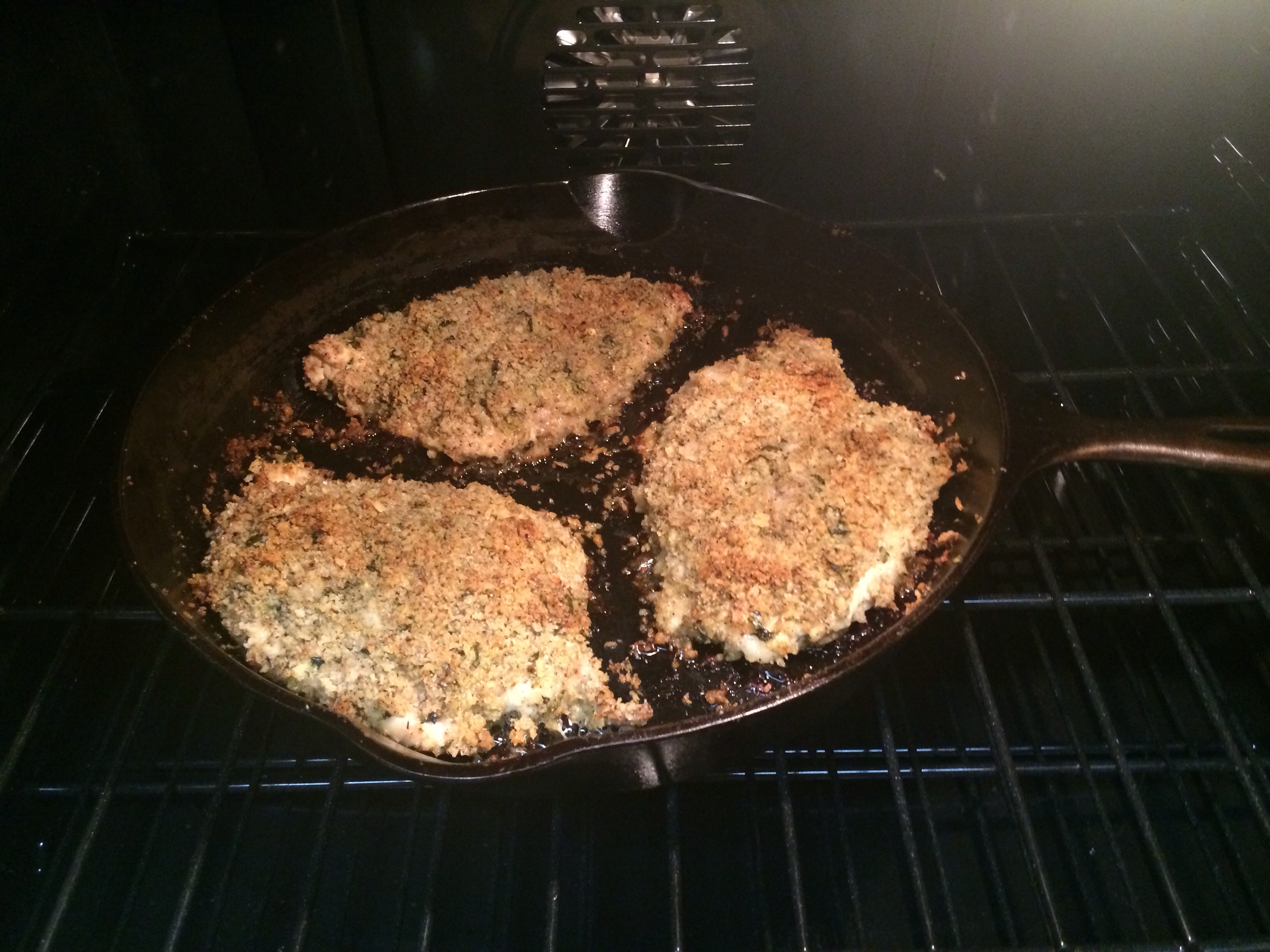 Spoon mixture over chicken and spread on both sides, packing and pressing into each piece, firmly. Place in oven on middle rack and bake 40 minutes.