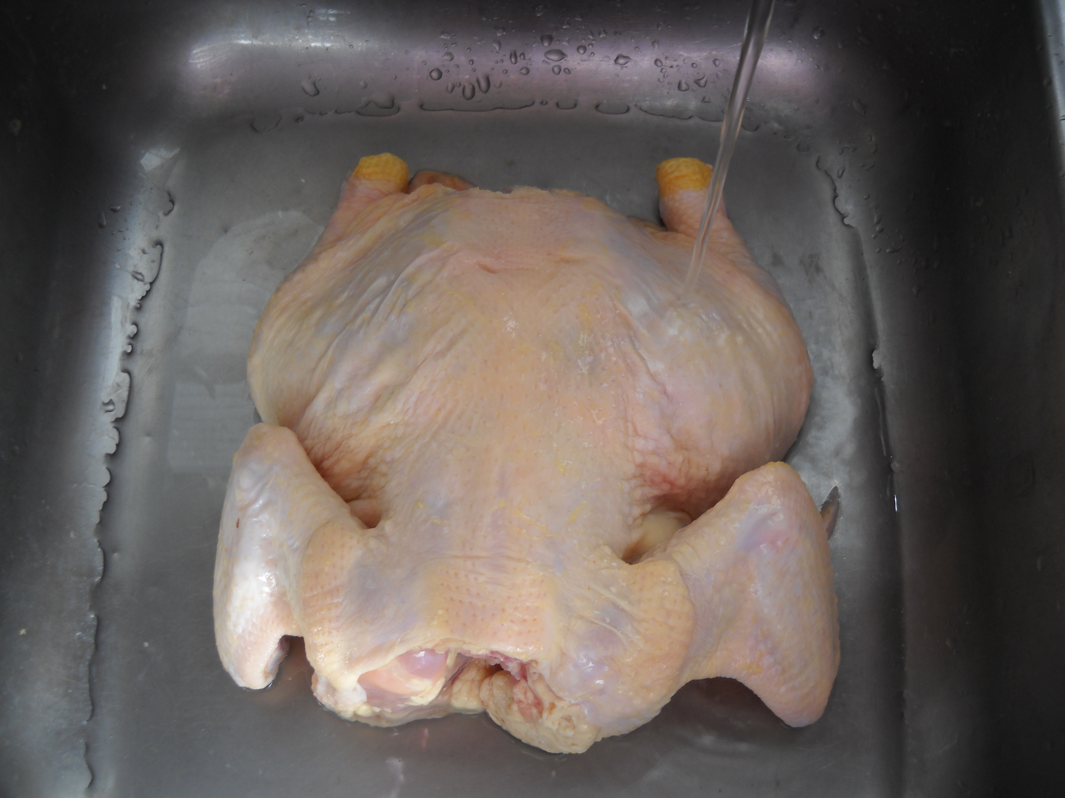 Prepare your chicken. Remove from wrapping and remove any inner organs from the cavity of the bird. Wash and clean thoroughly in a sink, making sure to observe poultry safe handling procedures.