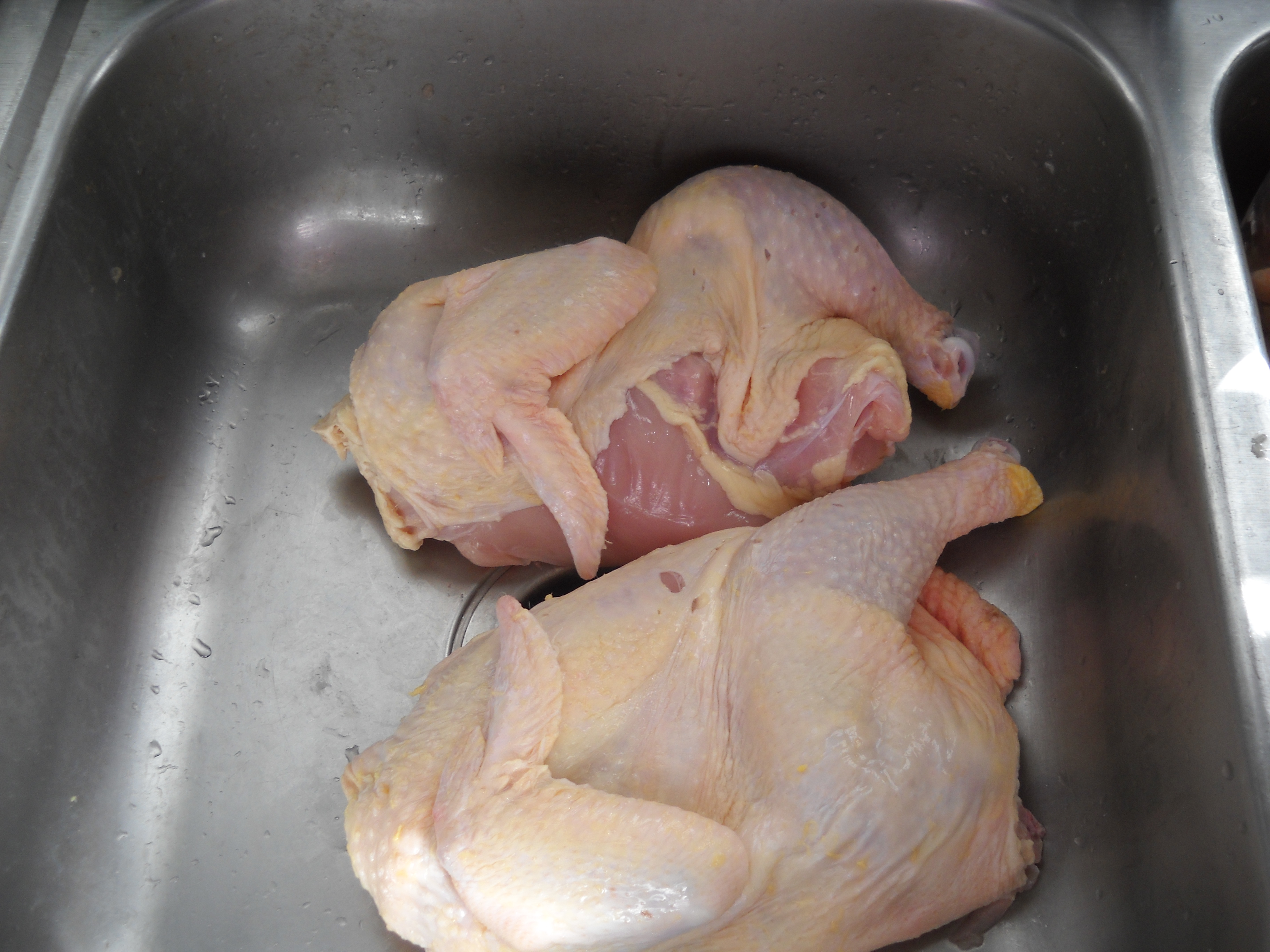 After cleaned again in sink, slowly add the chicken halves into the Ziploc bags, making sure all etra air has been squeezed out of the bags.