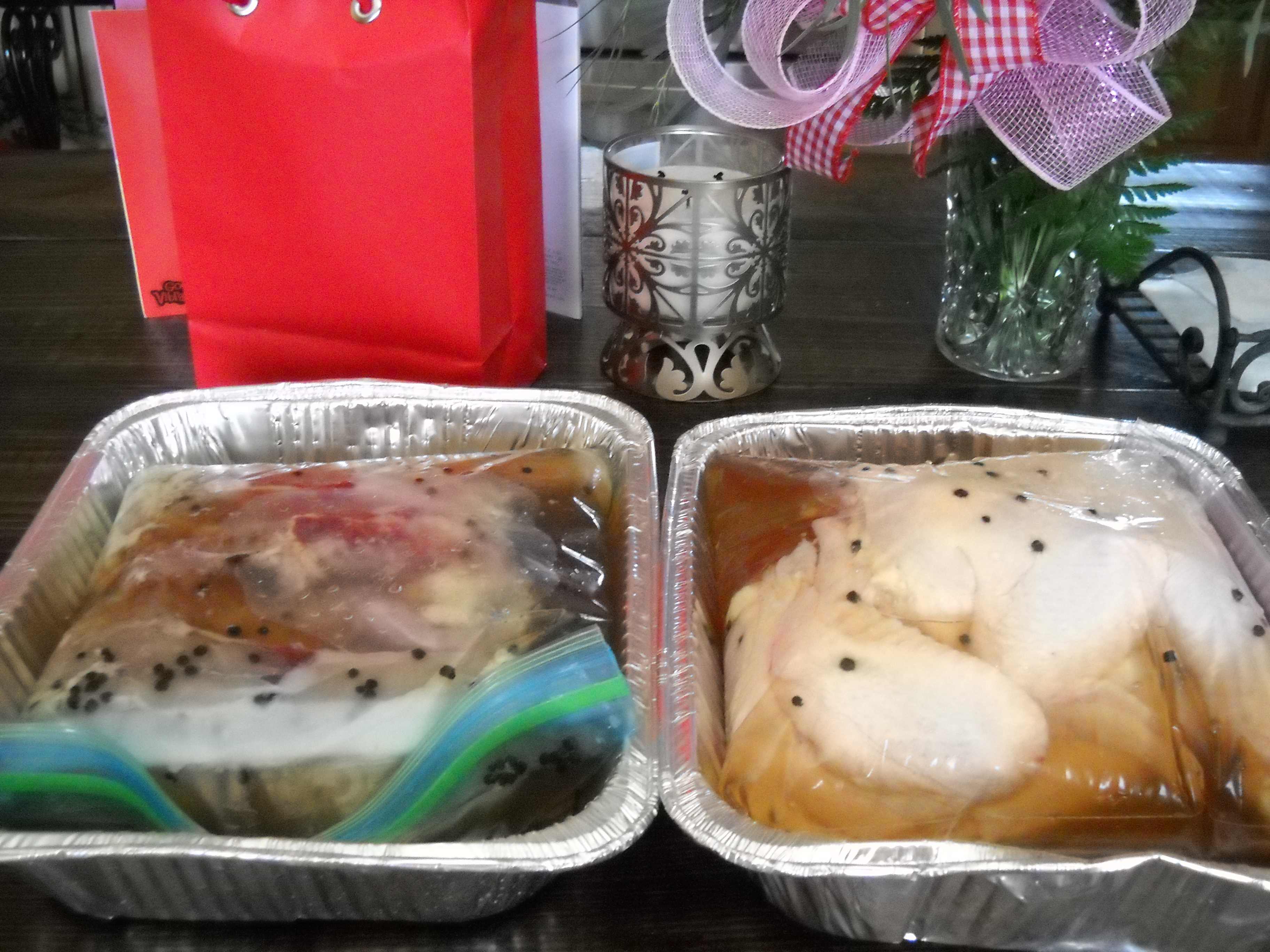 I like to put the bags into aluminum pans as they soak at minimum of 4 hours for 4-6 pound birds in the fridge. You can even let them sit overnight, but I have found that 4 hours is fine. A turkey or larger birds must brine overnight!