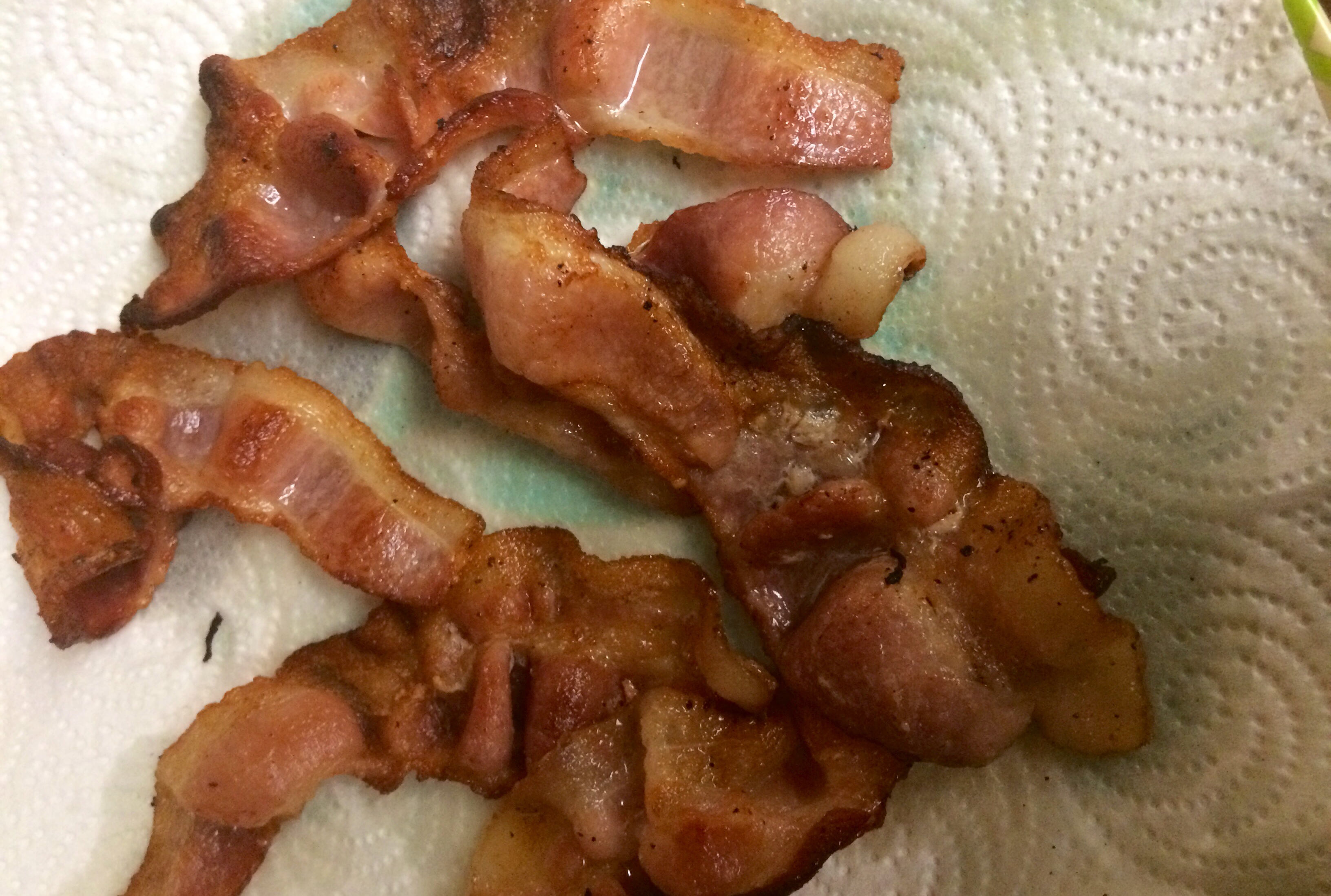 Cook bacon in a large skillet over medium heat. Remove to plate lined with paper towels. Keep bacon drippings. Turn off skillet. Let cool about 15 minutes. Add rinsed and drained green beans to bacon grease. Turn heat back up on burner to medium. Sauté beans just to slightly brown.
