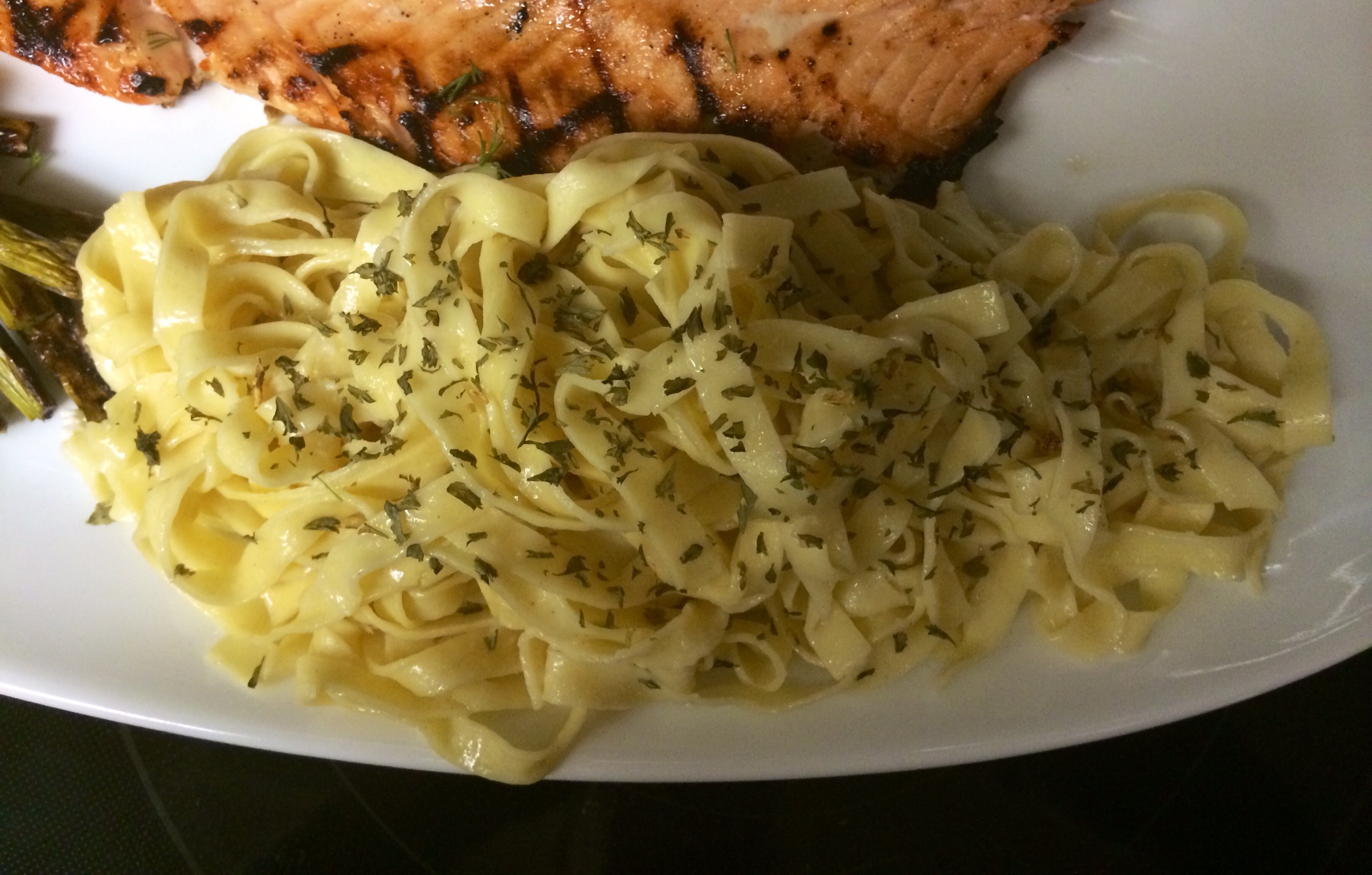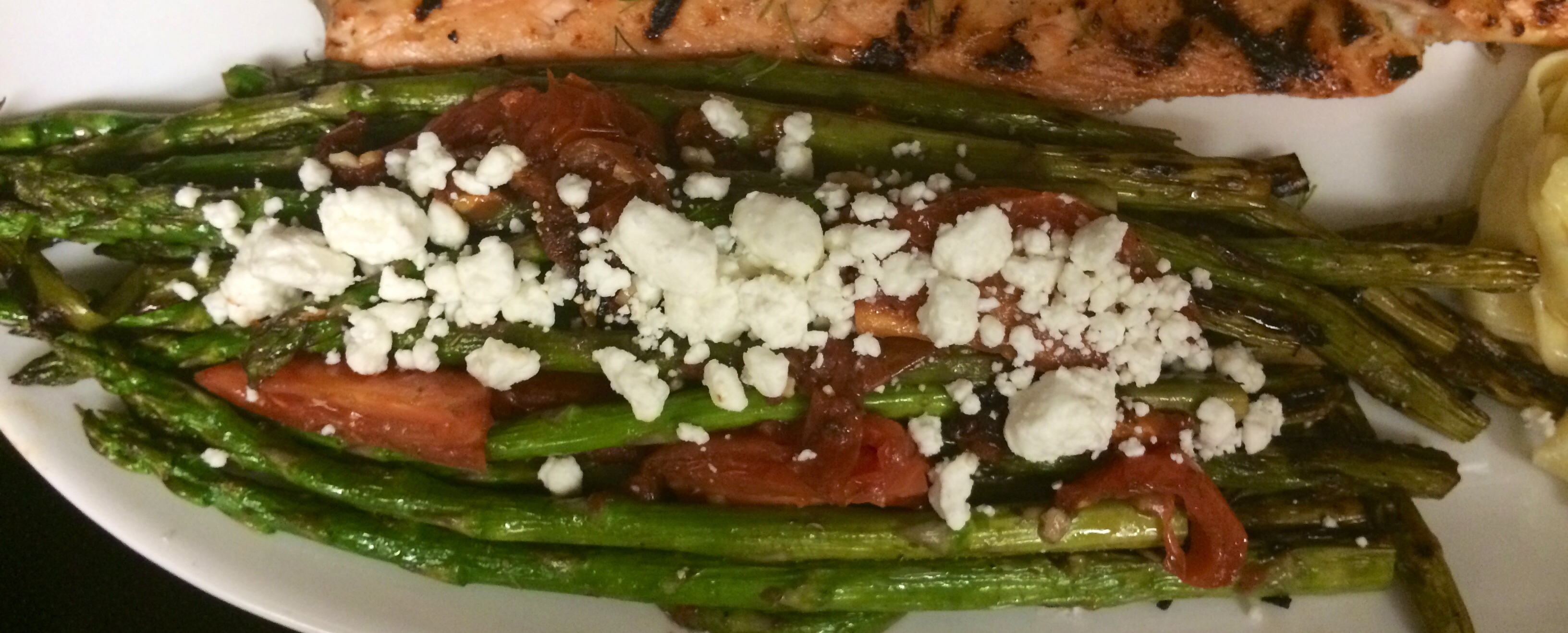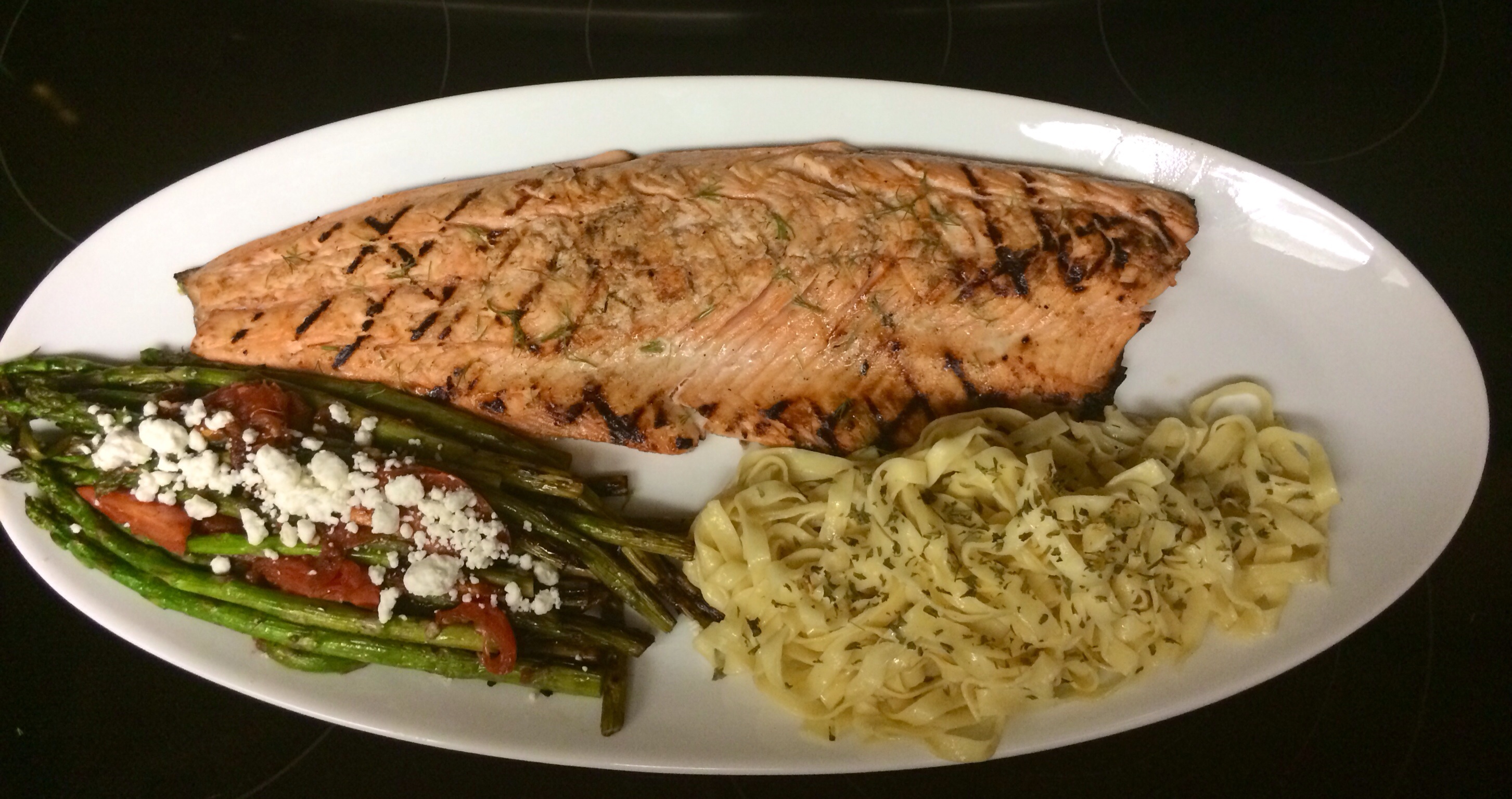 Grilled Salmon with Asparagus, Tomatoes and Fettucine