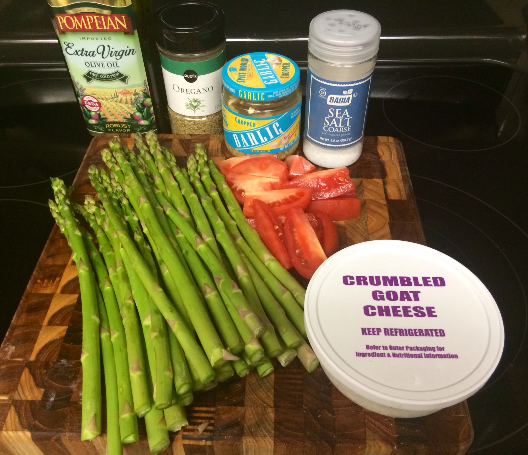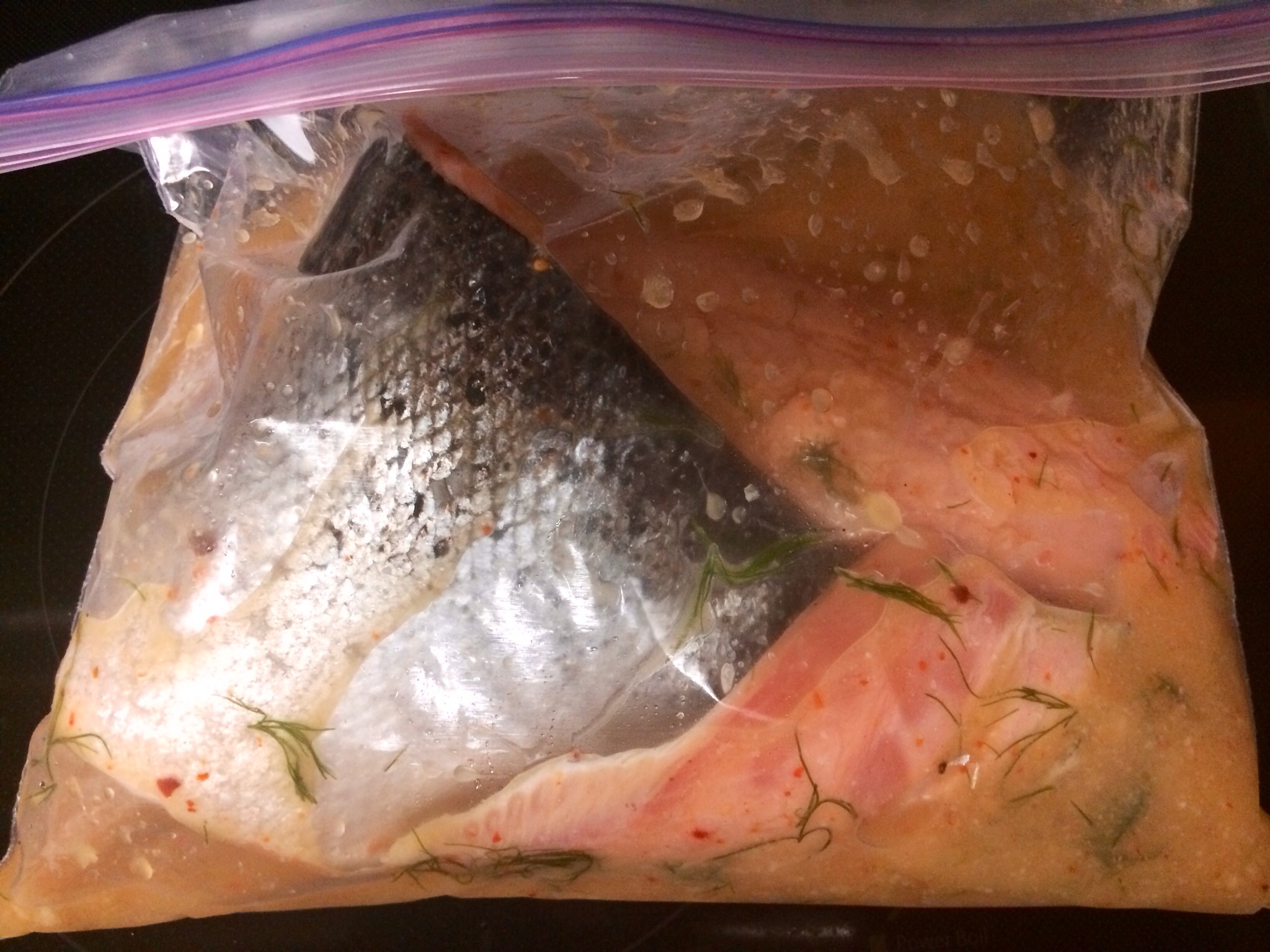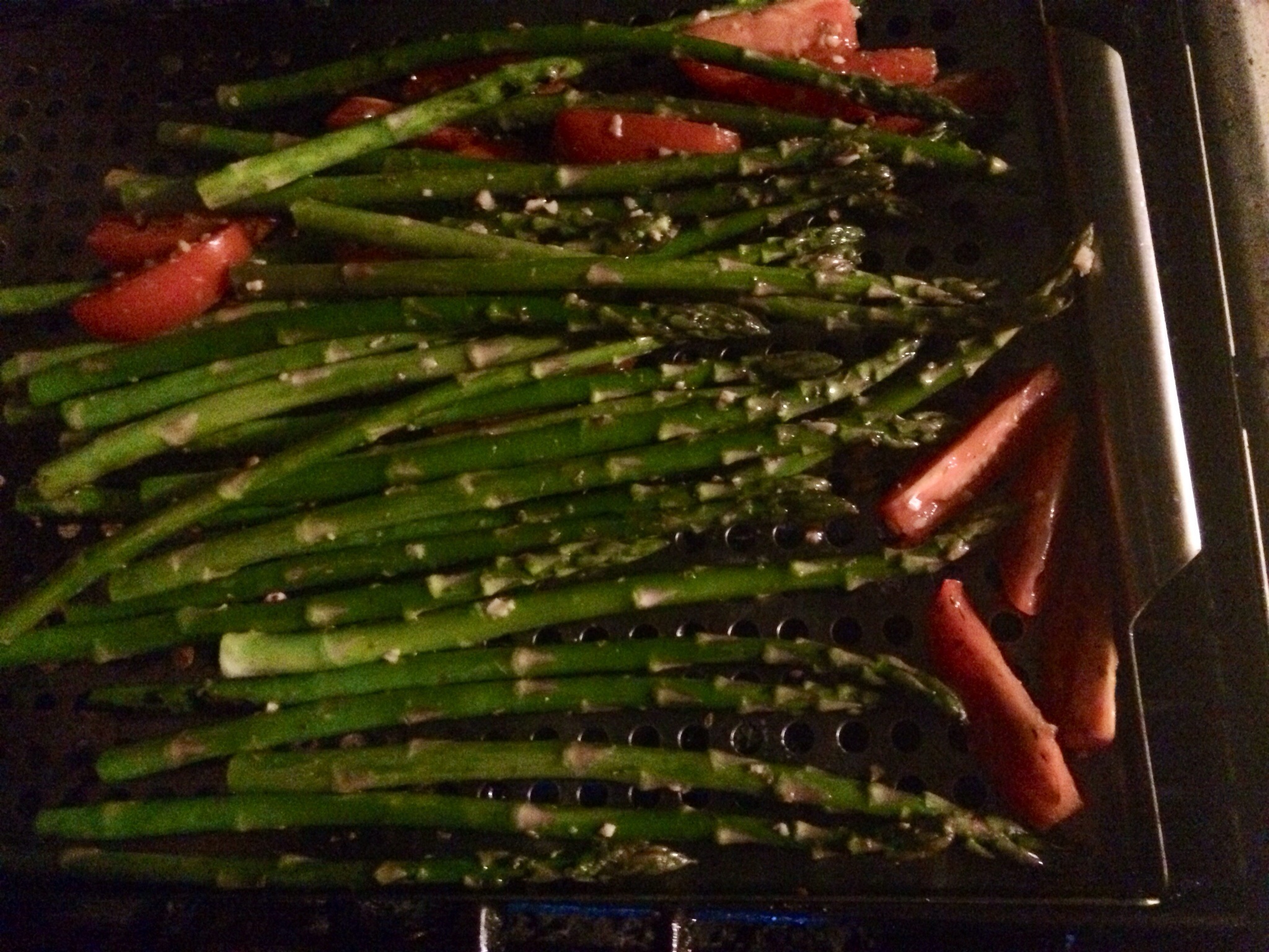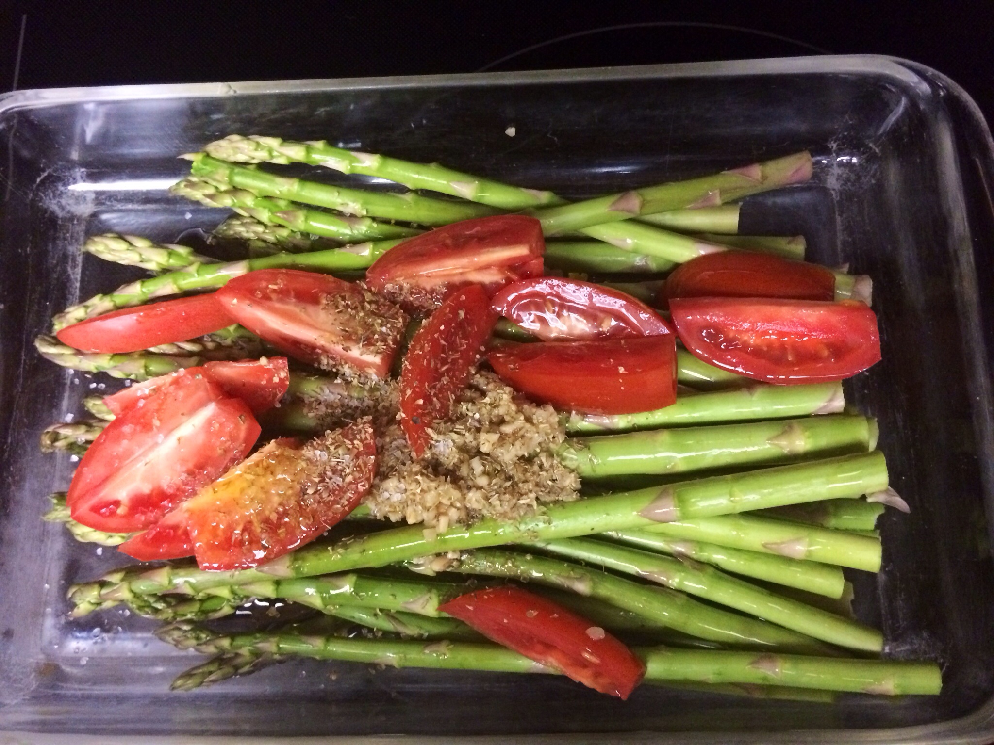 Place salmon in a zip-lock bag. Pour marinade over all and marinate in refrigerator 2 hours. Prep asparagus and tomatoes.