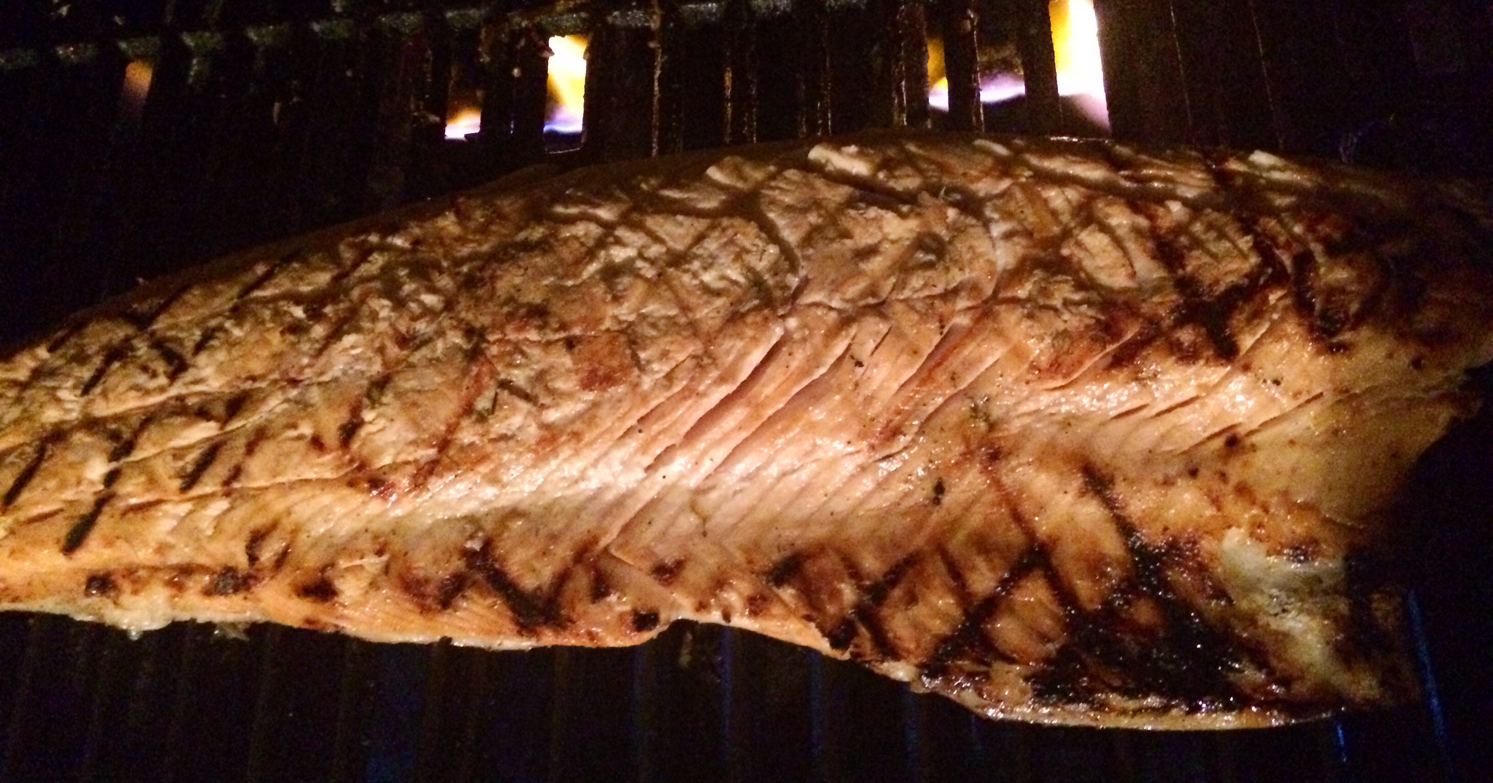 Place salmon on hot grill grates (for grill marks, 3 minutes at a 45 degree angle and 3 minutes adjusted at and opposite 45 degree angle), skin-side up, for 6 minutes. Flip salmon carefully so it is skin-side down. Cook on low for approximately 8 minutes, depending on thickness of salmon. Remove from grill to rest.