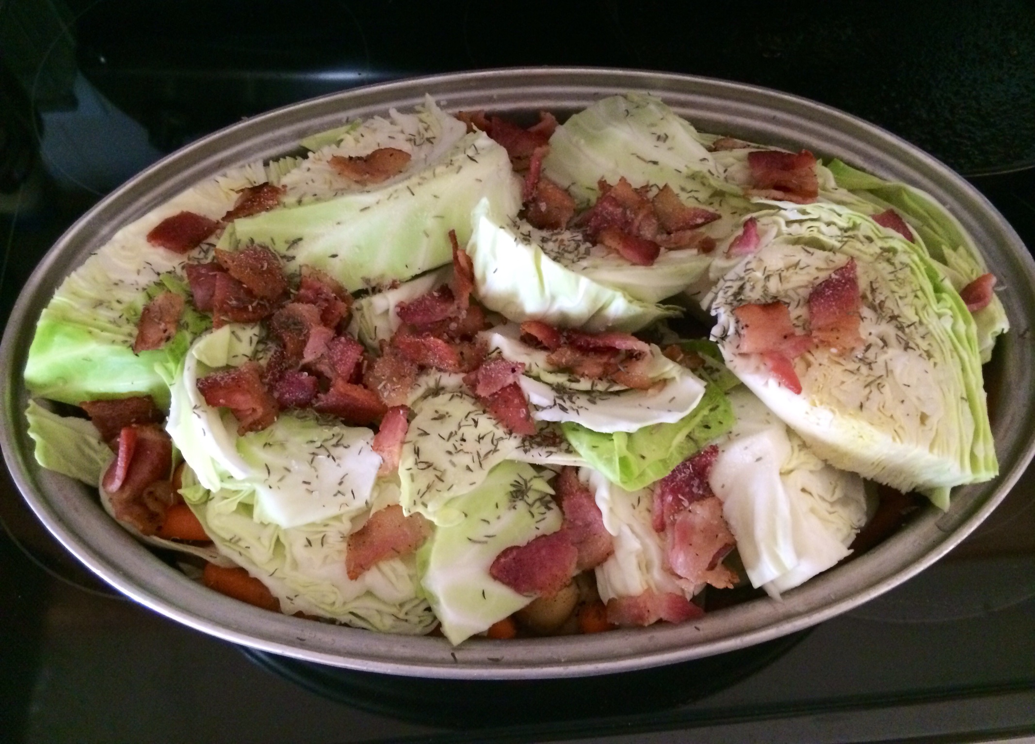 Rinse, quarter and slice cabbage. Add to baking dish. Top with bacon, thyme, onion powder, salt and rosemary. Cover and bake 3-4 hours, removing halfway through and stirring well. Once done, let rest 10 minutes. Cut up brisket into chunks. Rest 10 more minutes.