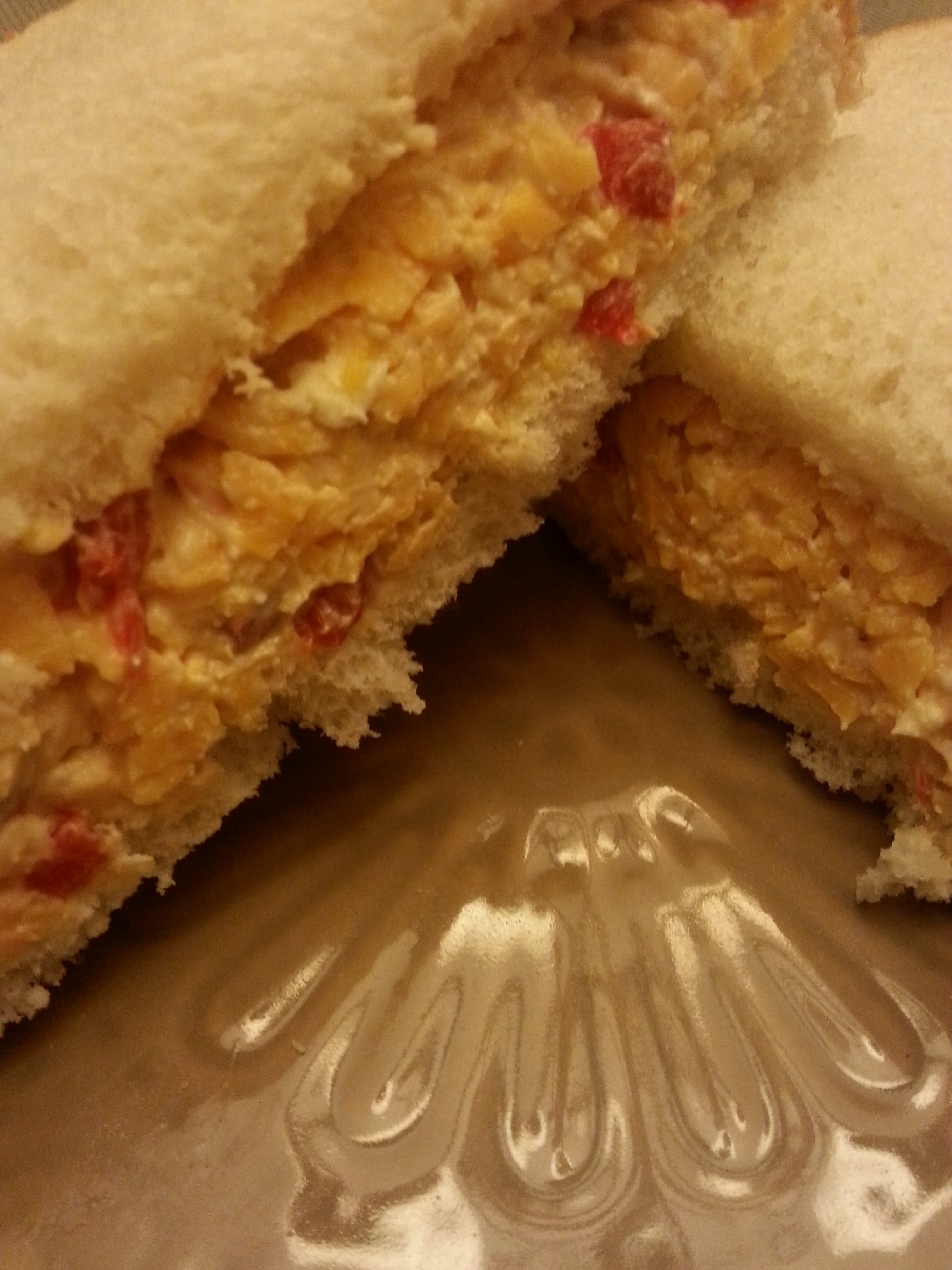 It’s called the Caviar of the South and there is a real reason why it is called that Name of Honor! Cheesy goodness with the complementary zing of the pimento in a base of Mayonnaise with some extras. And my Husband LOVES it as much as I do! Now my Momma makes hers with 3 ingredients: Grated Velveeta Cheese, Pimentos and Miracle Whip. She likes it sweet, small and smooth, just like her. I loved hers until Rex Walls, a Pharmacist that took me under his wing after my Daddy died, made some for us at work one night. I thought I had died and gone to Cheesy Heaven! It was lumpy, cheesy and thick (like me) in Duke’s Mayonnaise! I have eaten others so have added additional tastes like Cayenne and Worcestershire. Make it grilled as below or plain on thick bread slices. Or slap some on some Burgers on the Grill! Or just simply perfect alone in Celery Slices or served in a bowl with tomatoes and slices of Dill Pickles. ![Ingred[1]](https://twocousinsandaskillet.com/wp-content/uploads/2015/03/ingred1.jpg?w=225&h=300)