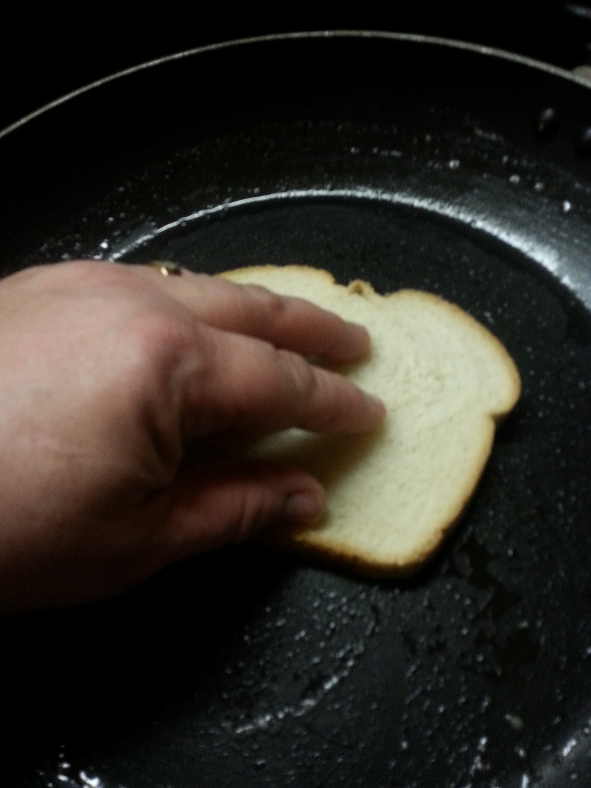 Place the bread butter side down in your pan. The butter will melt and so you need to swirl it around the pan making sure to look and see that the butter is coating the bread evenly.