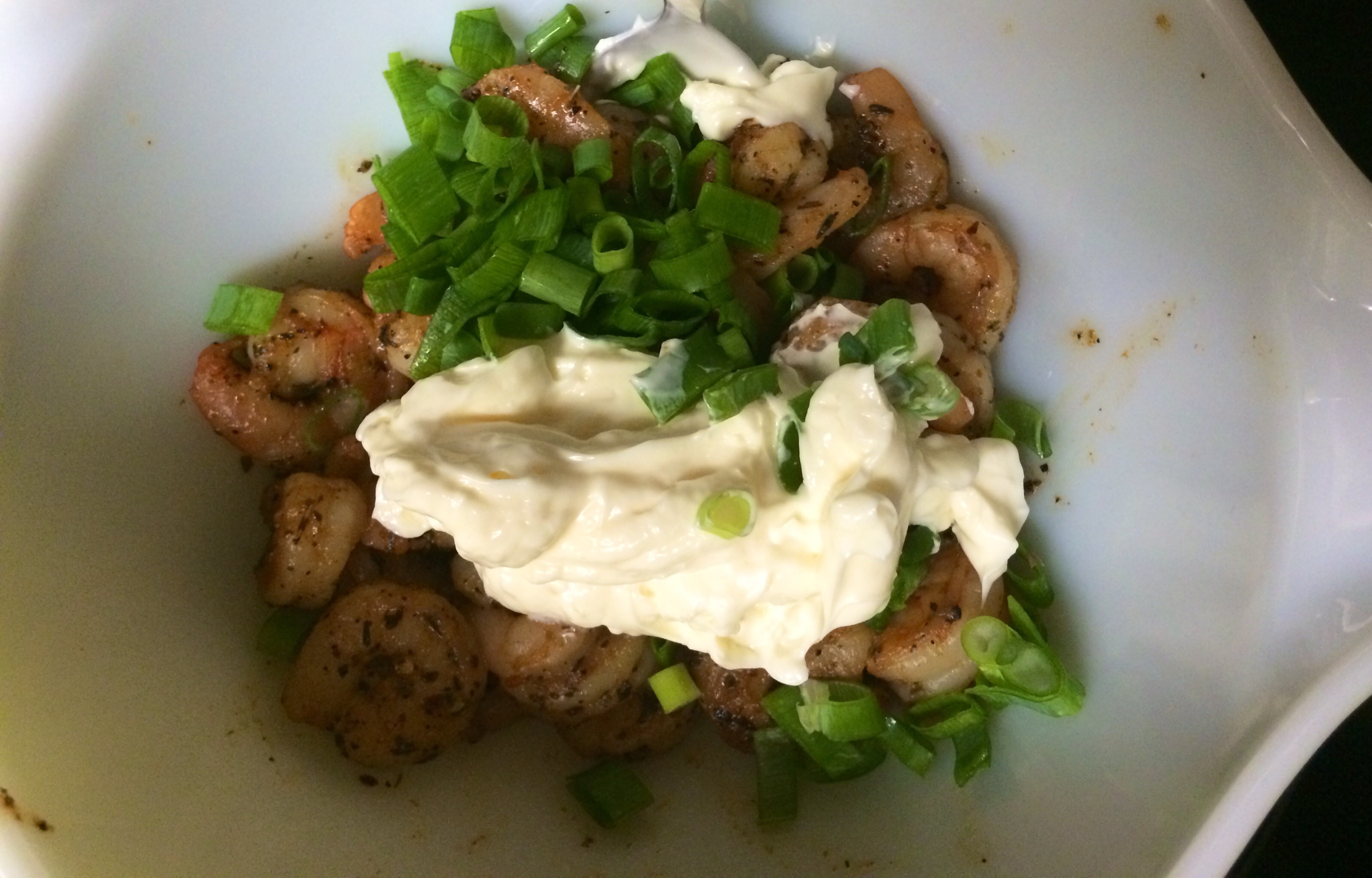 Add shrimp to small mixing bowl with scrapings from skillet. Let cool.