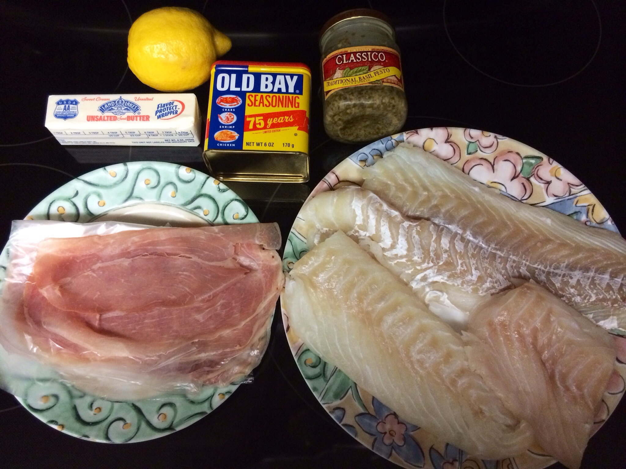 Prosciutto Wrapped Cod With Butter, Lemon and Pesto Sauce