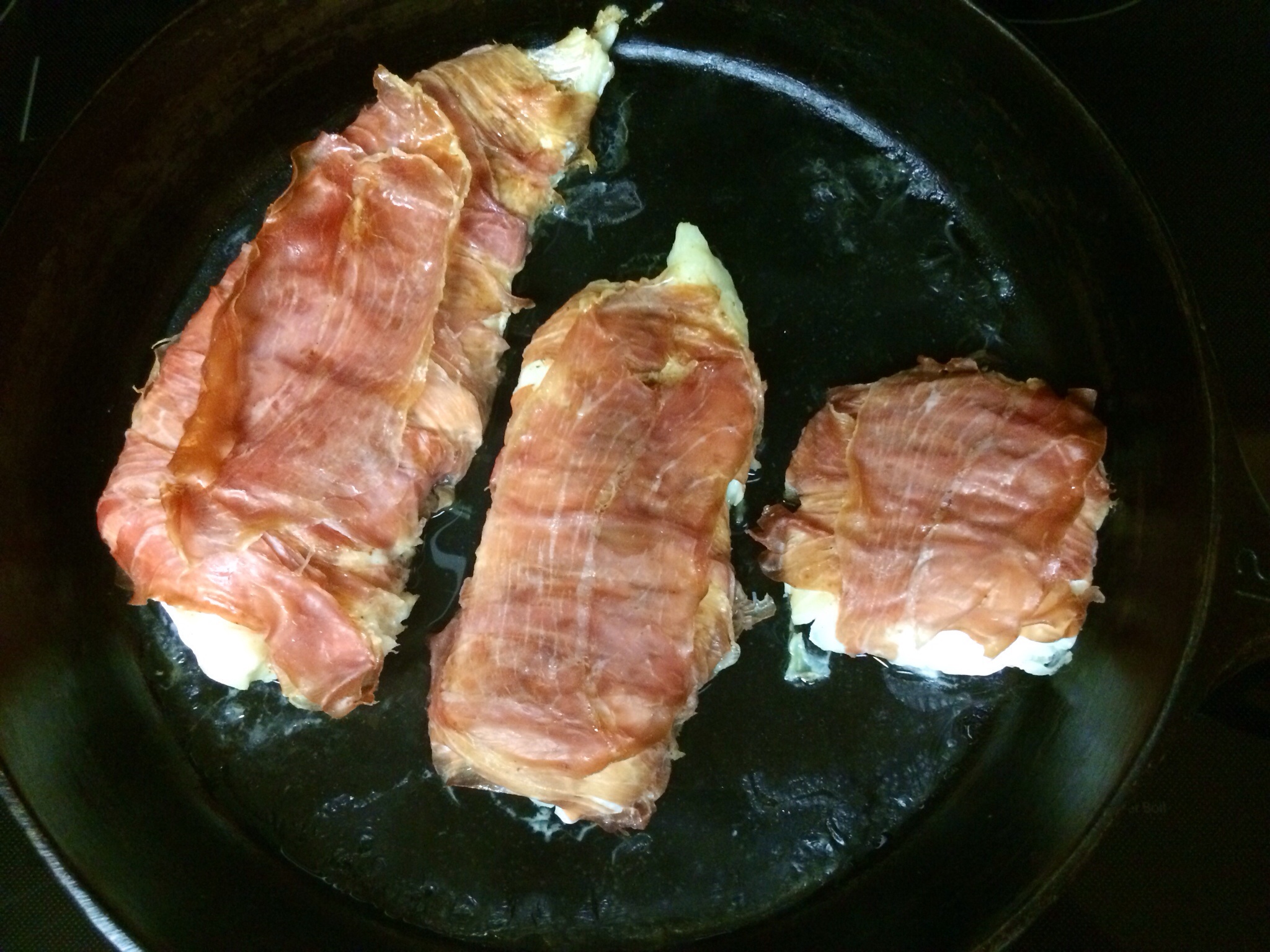 Wrap tops of each filet in prosciutto slices and place in cast iron skillet or baking dish.
