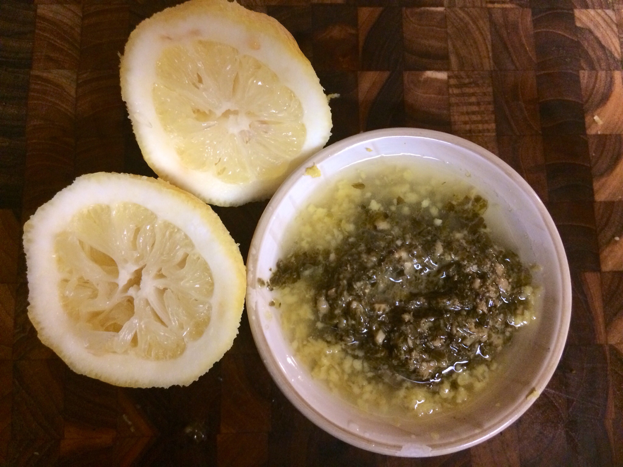 In a small bowl, zest and juice one lemon and add pesto. Add to melted butter in skillet and stir well.