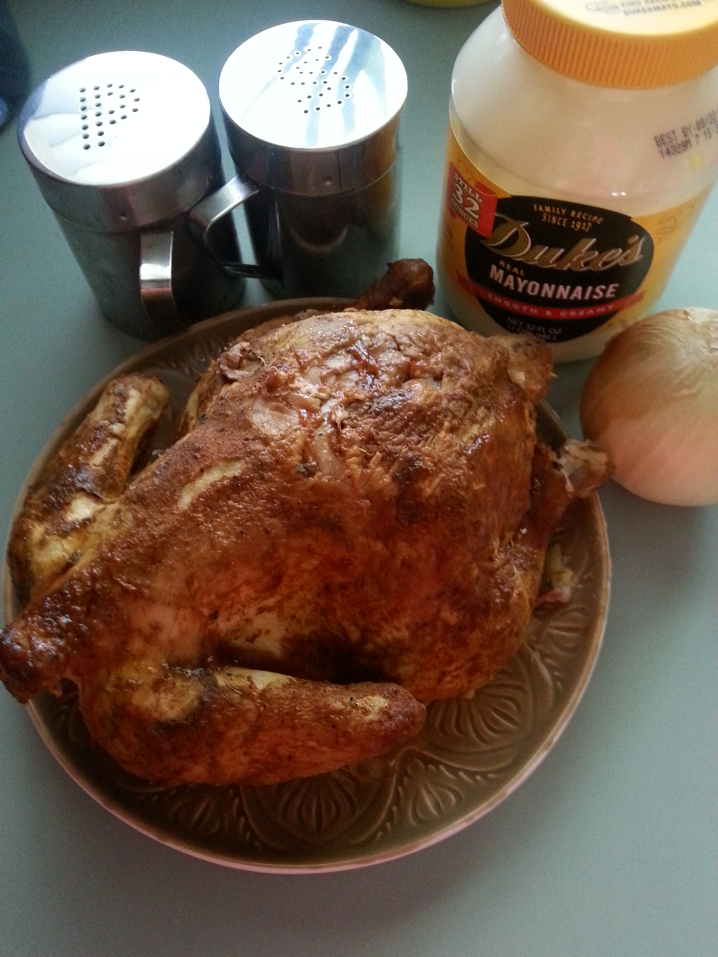 This is my Momma Kemp’s recipe with my addition – I smoke the brined chicken for about 4 hours with Applewood Chips and my own rub. I also use Dale’s Mayonnaise. It adds a smooth tanginess to this fabulous spread. You can bake a chicken or buy one smoked from your local BBQ joint. A rotisserie one from your local grocer would work, but you wouldn’t the divine smokey flavor! You can even used Sweet Sue chicken in a can in a pinch…..but If you have the time, try this recipe. It makes the Hubs smile!