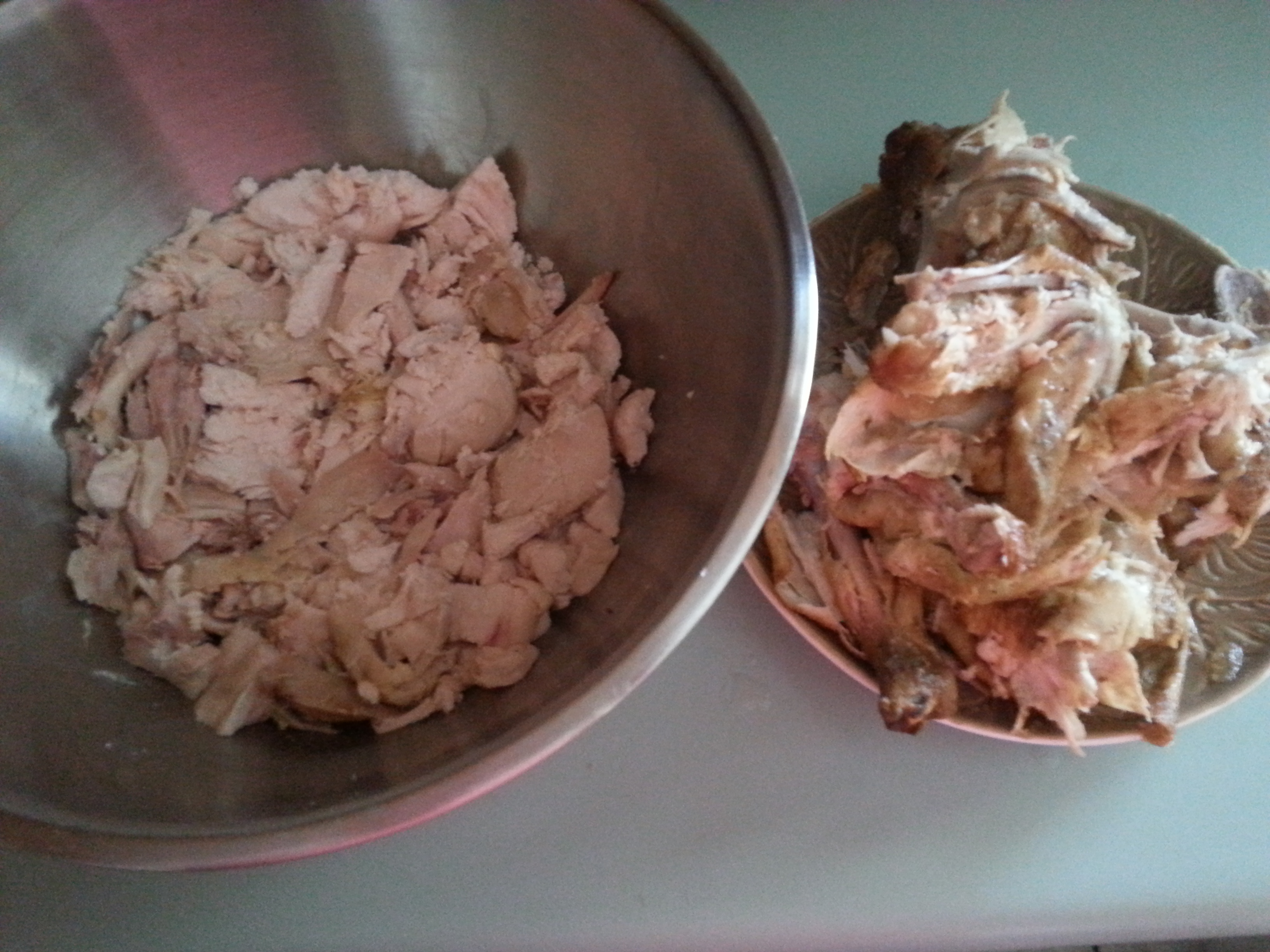 Remove the skin from the chicken as you take as much meat as possible off the chicken bones.