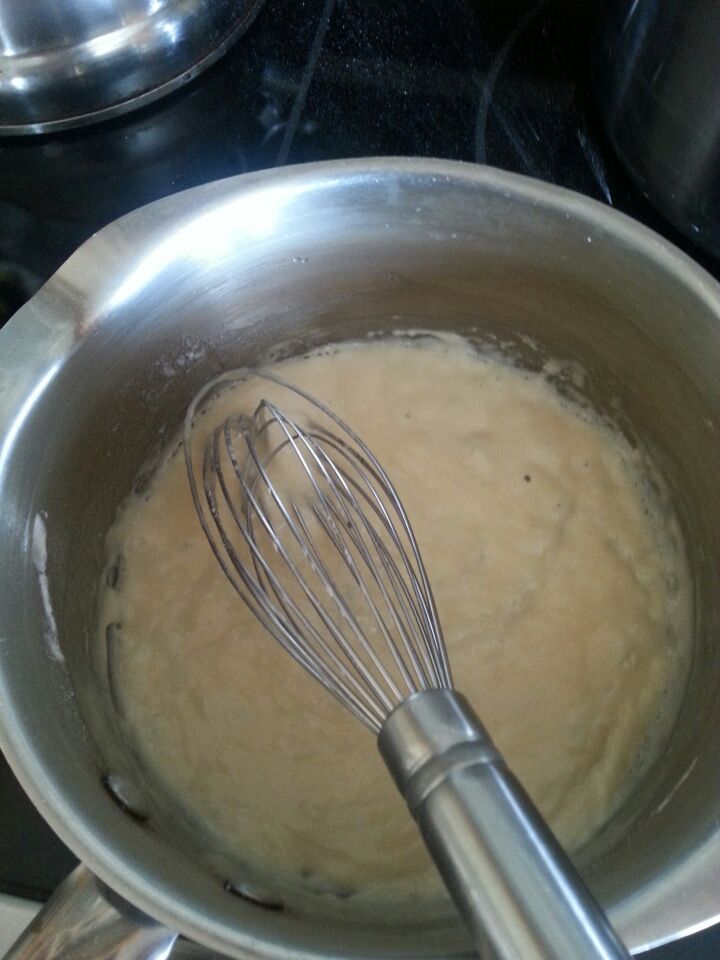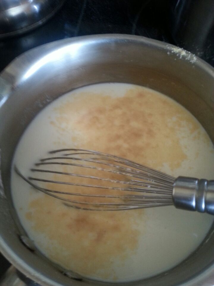 In a small bowl, beat the egg. In a large saucepan, melt the butter and sprinkle in the flour. Whisk together over medium-low heat. Cook for a couple of minutes, whisking constantly. Don’t let it burn.