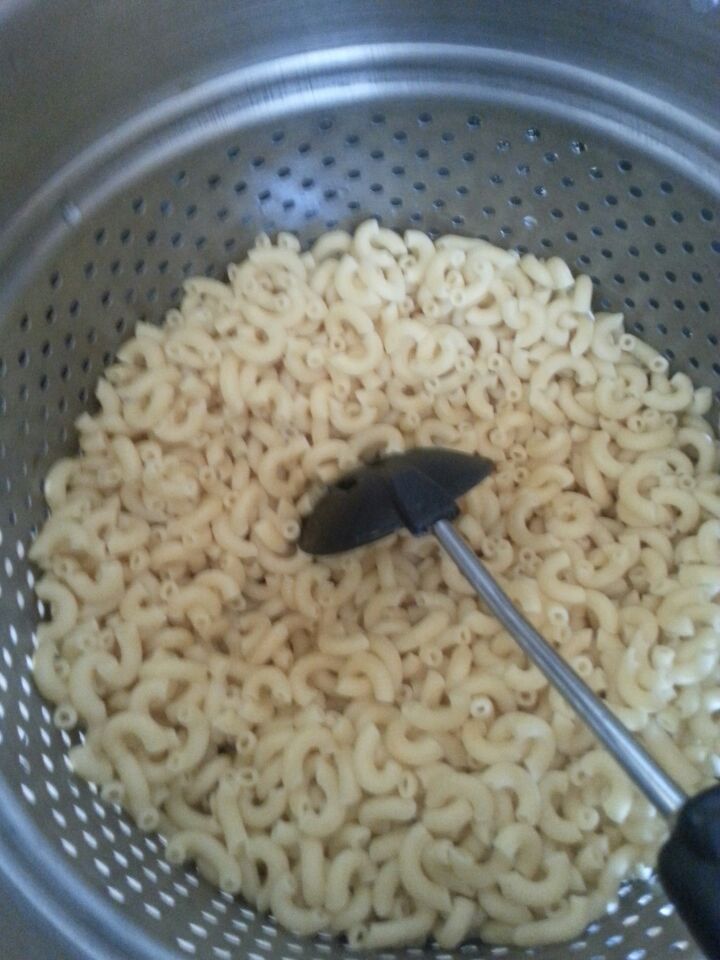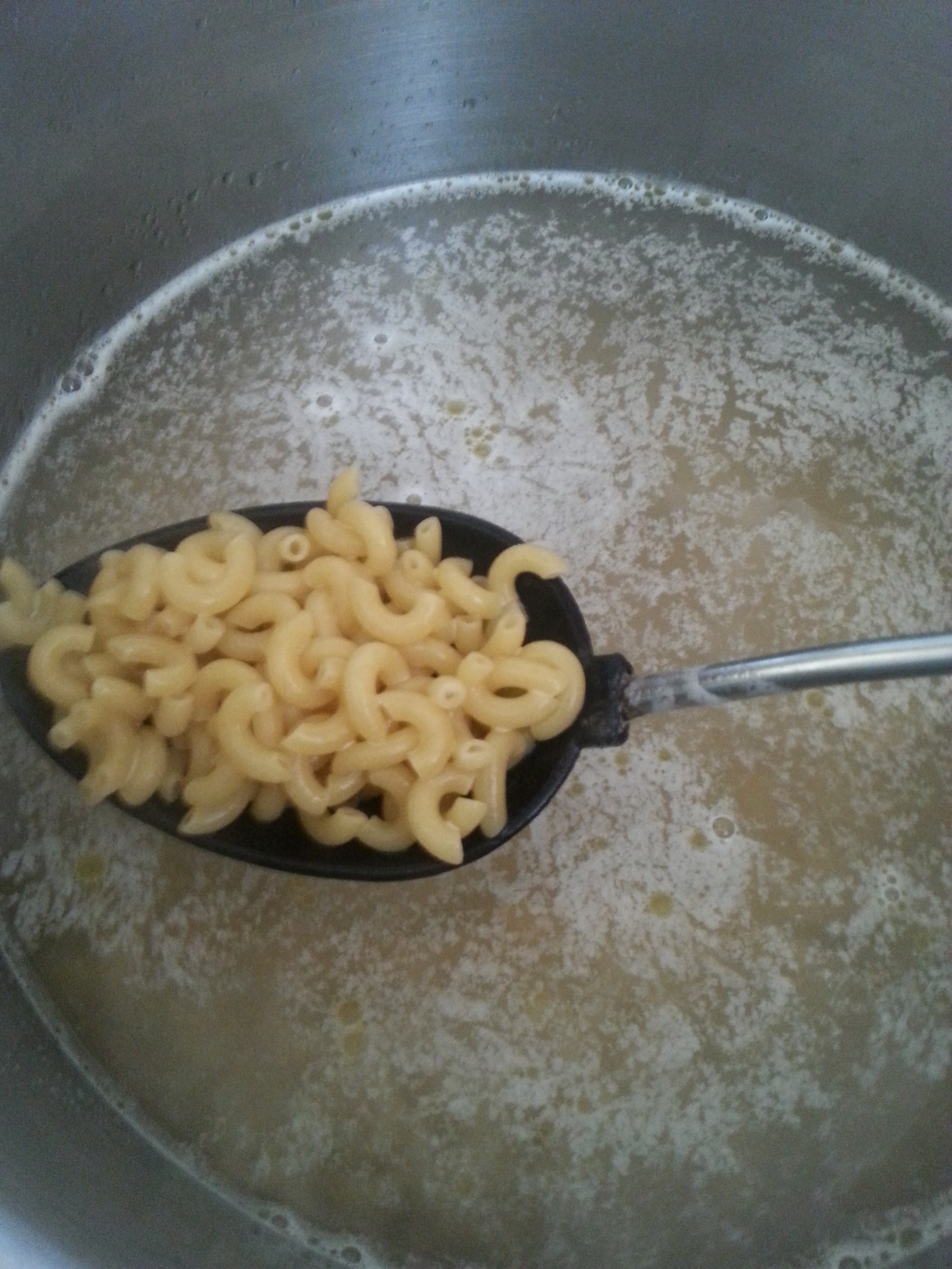 Cook the macaroni until still slightly firm or al dente per instructions. I cook the 4 cups of pasta in boiling water for 6 minutes. Drain and set aside back in the original pan.