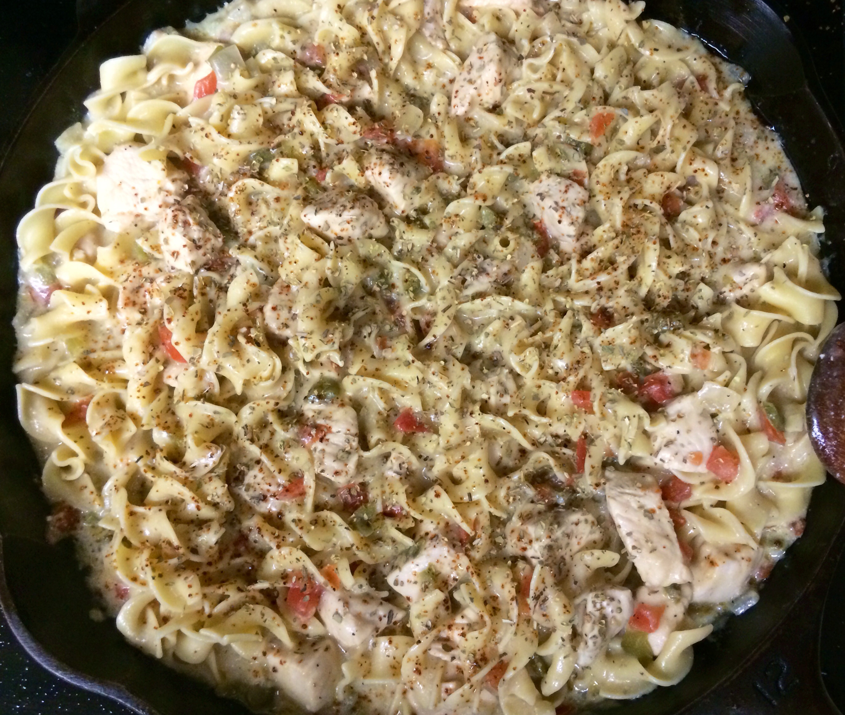 Add broth and soup to skillet. Add salt. Mix well. Add chicken back to skillet with pasta. Let simmer about 15-20 minutes or until pasta is soft. Top with cracked pepper.