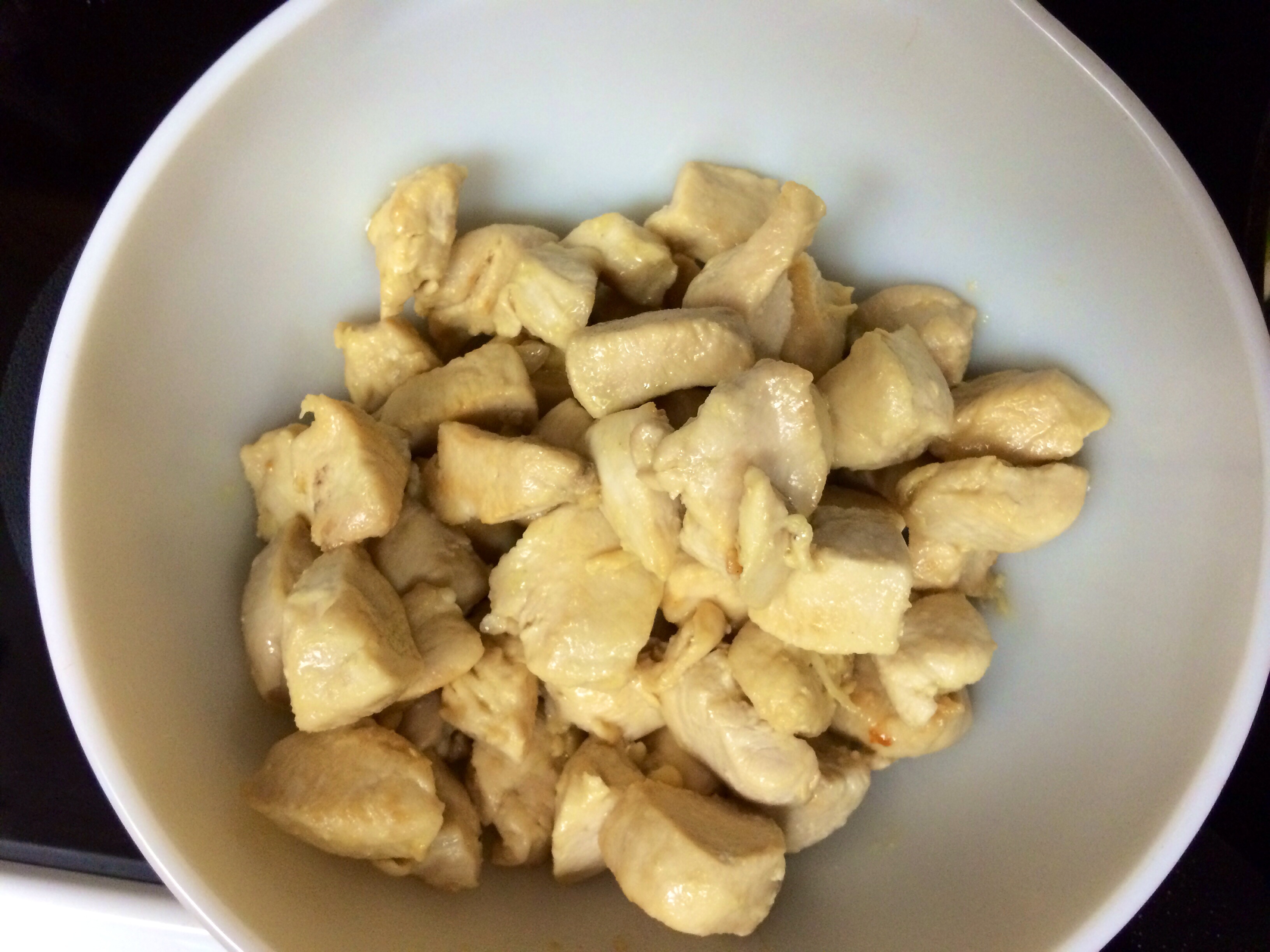 Drizzle 1 Tb of olive oil in a large skillet. Brown cubed chicken pieces until cooked through.