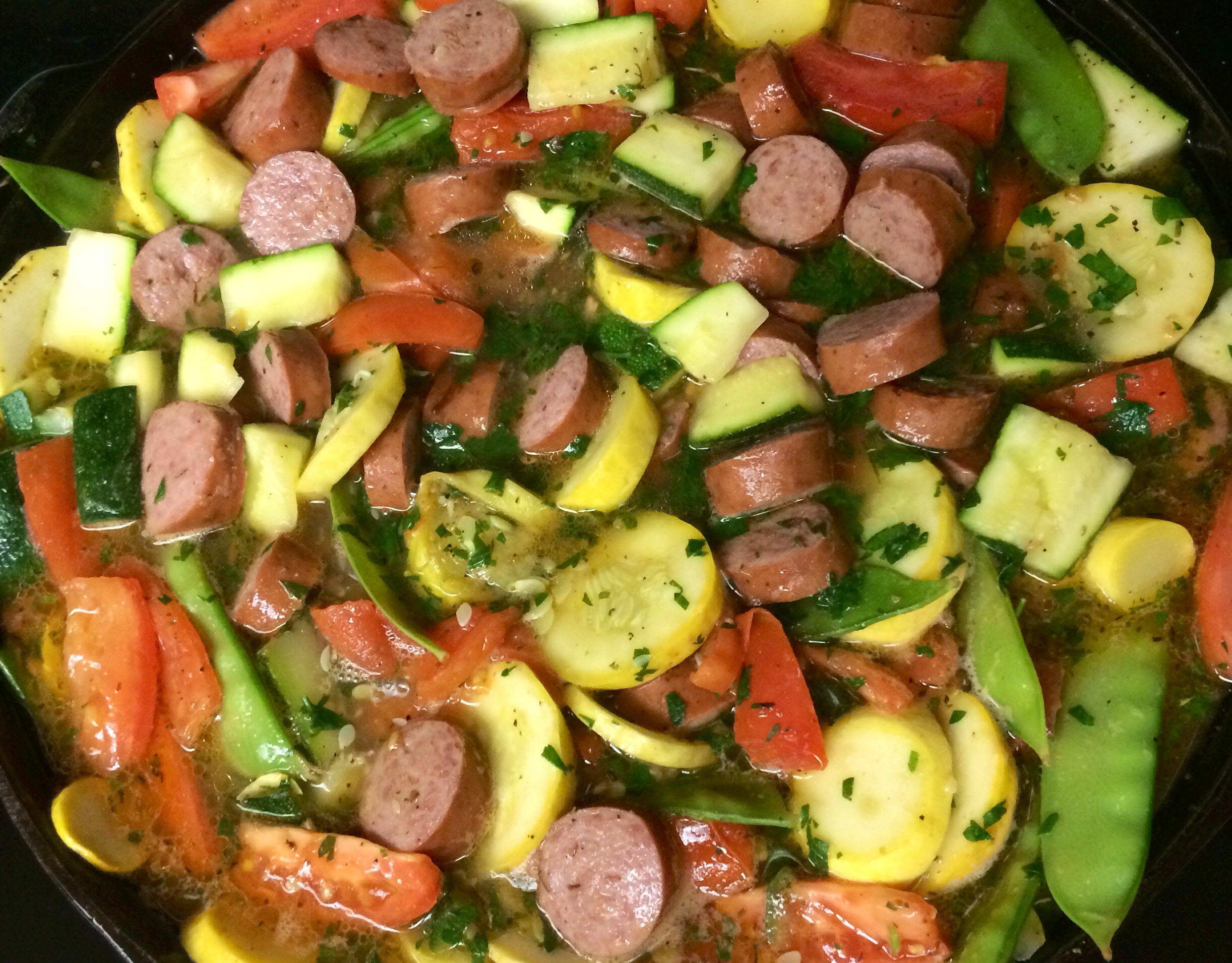 Heat a large skillet over medium heat. Add oil and sausage. Brown well. Add prepared vegetables and sauté. Add broth, salt and pepper. Reduce heat to simmer and cook about 20 minutes or until desired tenderness.