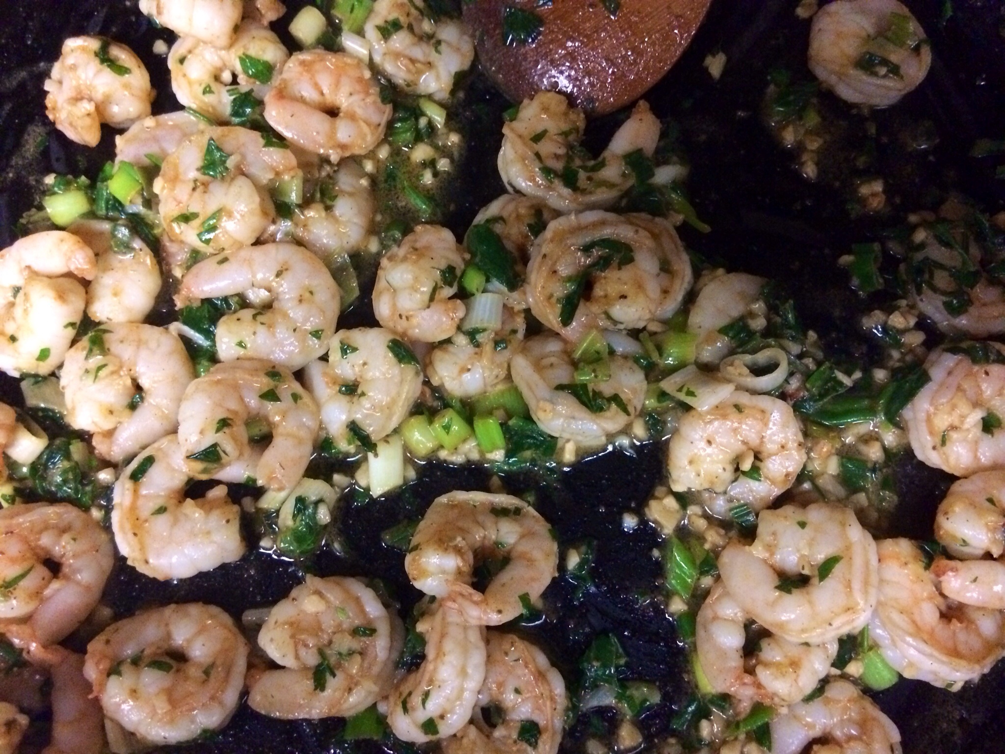 Add shrimp to skillet and sauté until tails curl on shrimp and they look pink. Add garlic and mix in. Reduce heat to low.