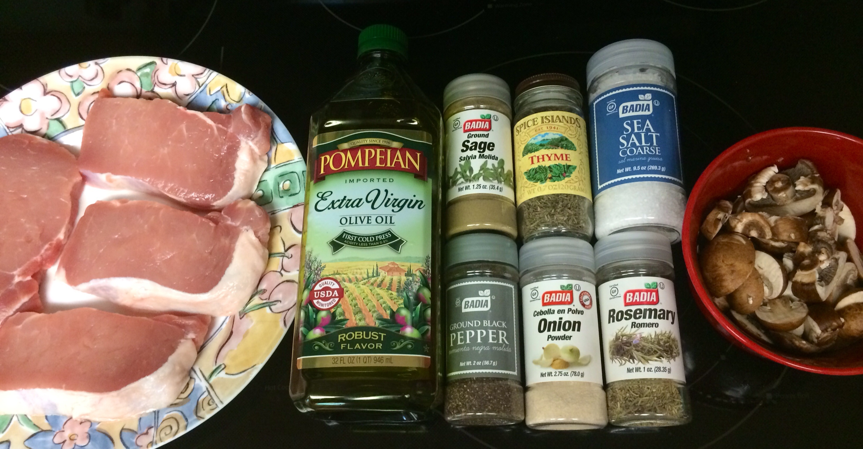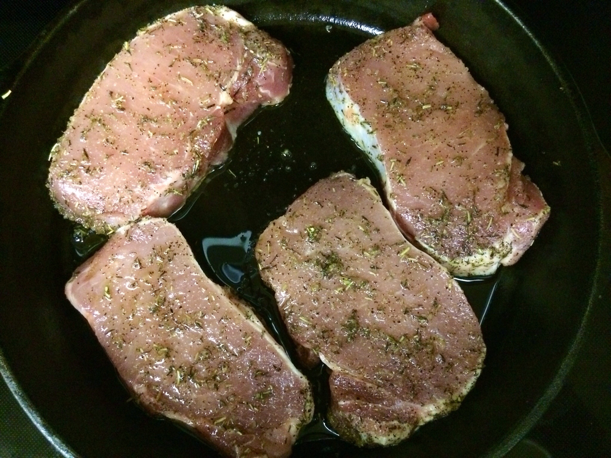 Dredge each pork chop in oil and spice mixture and place in a medium cast iron skillet or casserole.