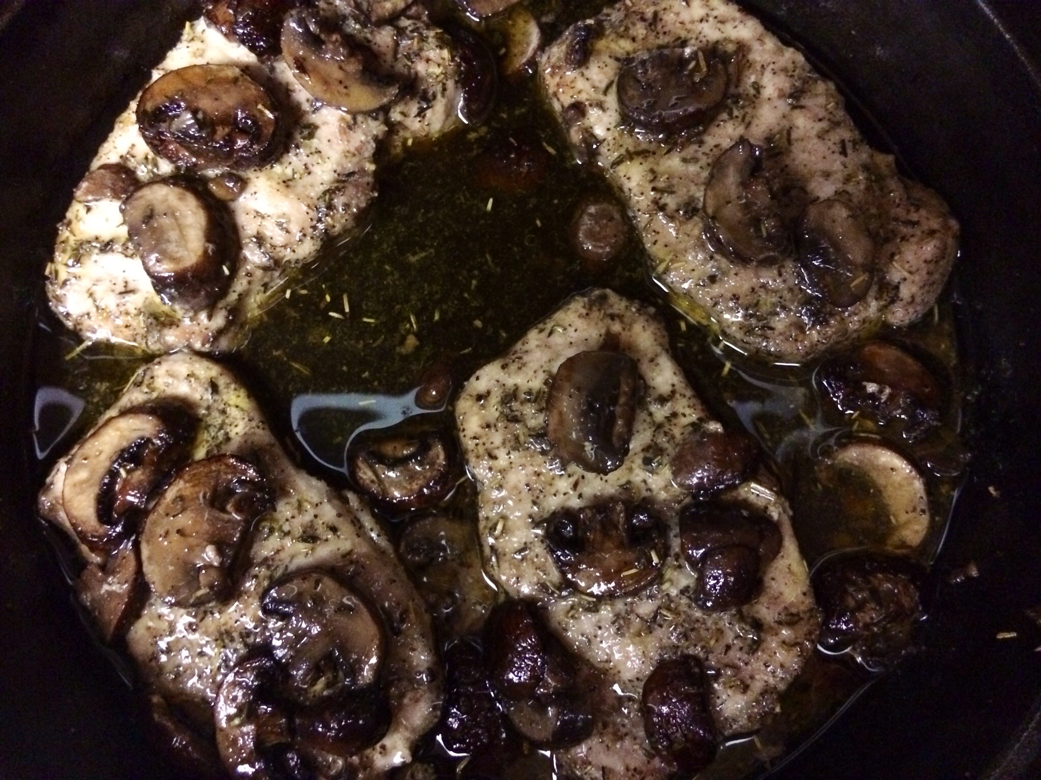 Add mushrooms to seasoned pork chops in skillet. Drizzle a little more oil over all. Bake on middle rack of oven 40 minutes.