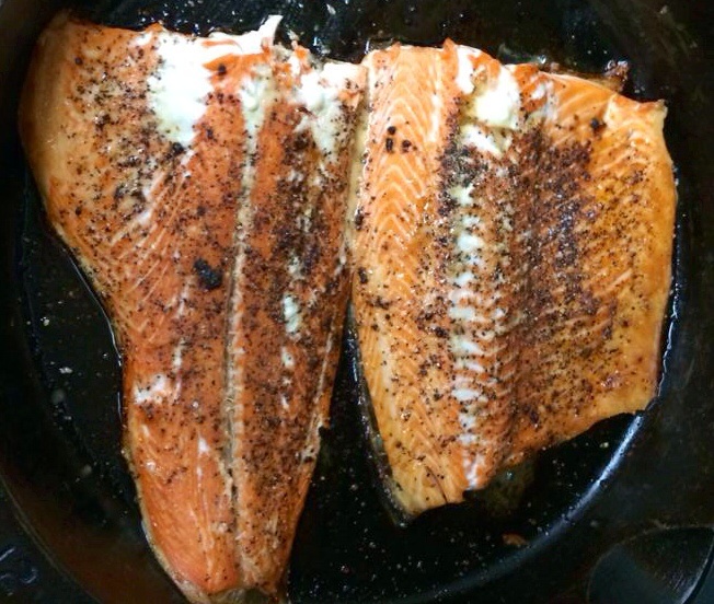 In a small bowl, combine oil and spices and mix well. Place trout filets in a large cast iron skillet or baking dish. Bake 35 minutes on middle rack. Switch oven to broil and broil 2 minutes, watching closely, until browned.