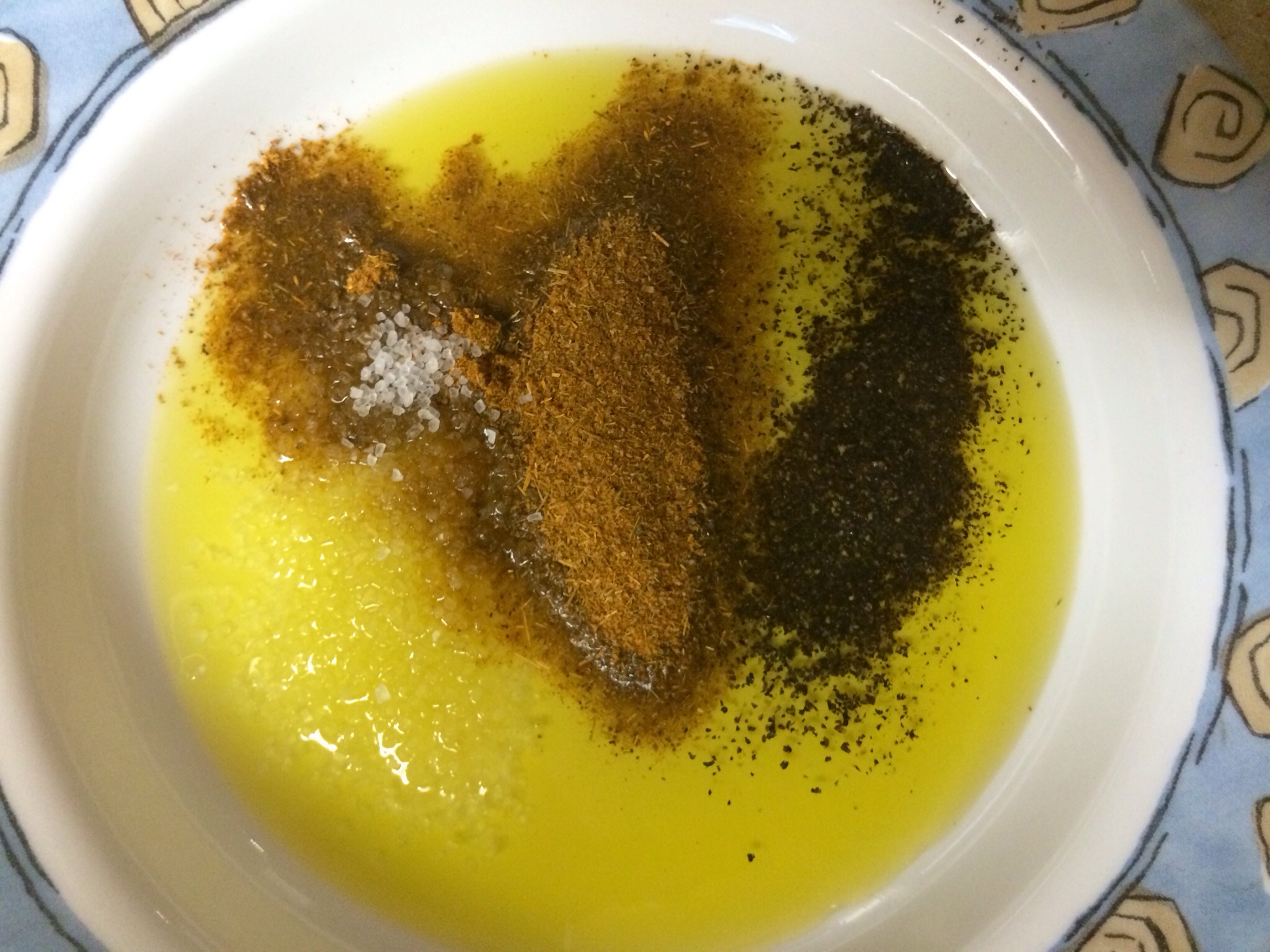 In a small bowl, add oil and spices. Mix well. Dip chicken pieces in mixture and massage over each piece.