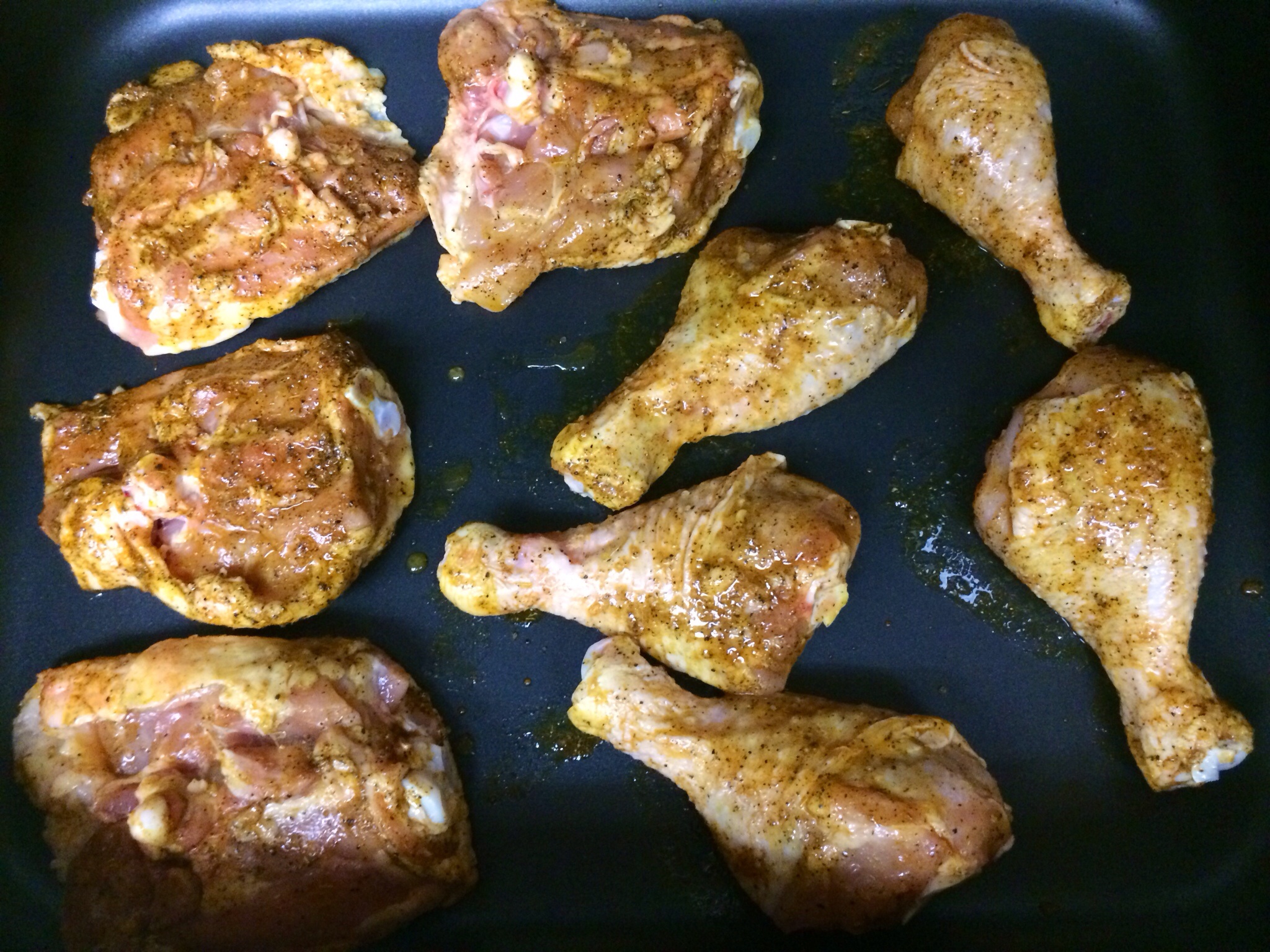 Place chicken pieces in roasting pan or casserole pan large enough to accommodate. Bake in oven, 20 minutes to release juices and spices. Remove pan from oven.