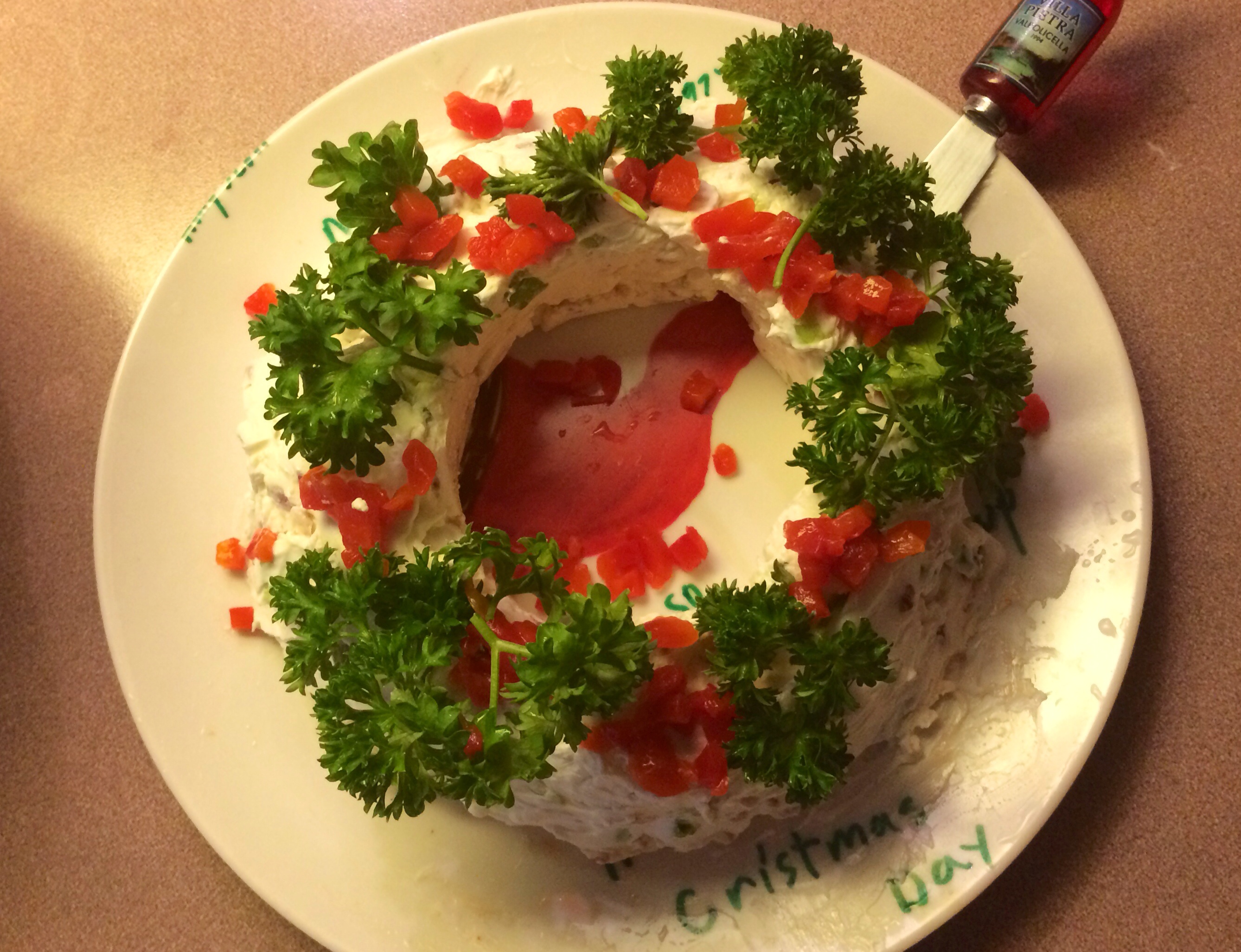 My mom, Helen, makes this at Christmas every year and it is so addicting. In the picture, it is shaped as a wreath, but can be shaped any way you prefer. If you prefer, you may garnish with 1/2 cup chopped pecans and it would still be wonderful. Serve with crackers or toasted bread slices. We hope you enjoy it!