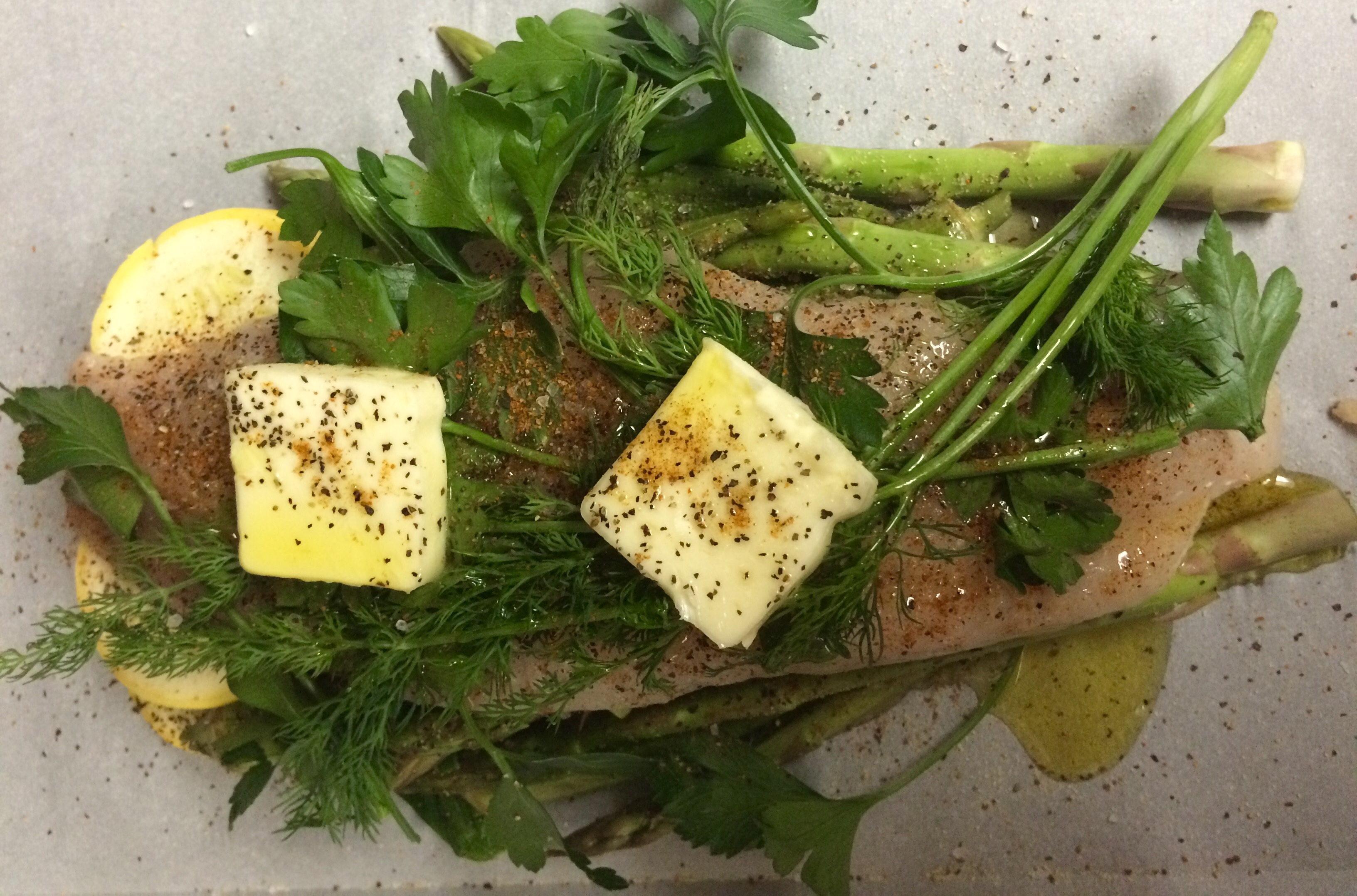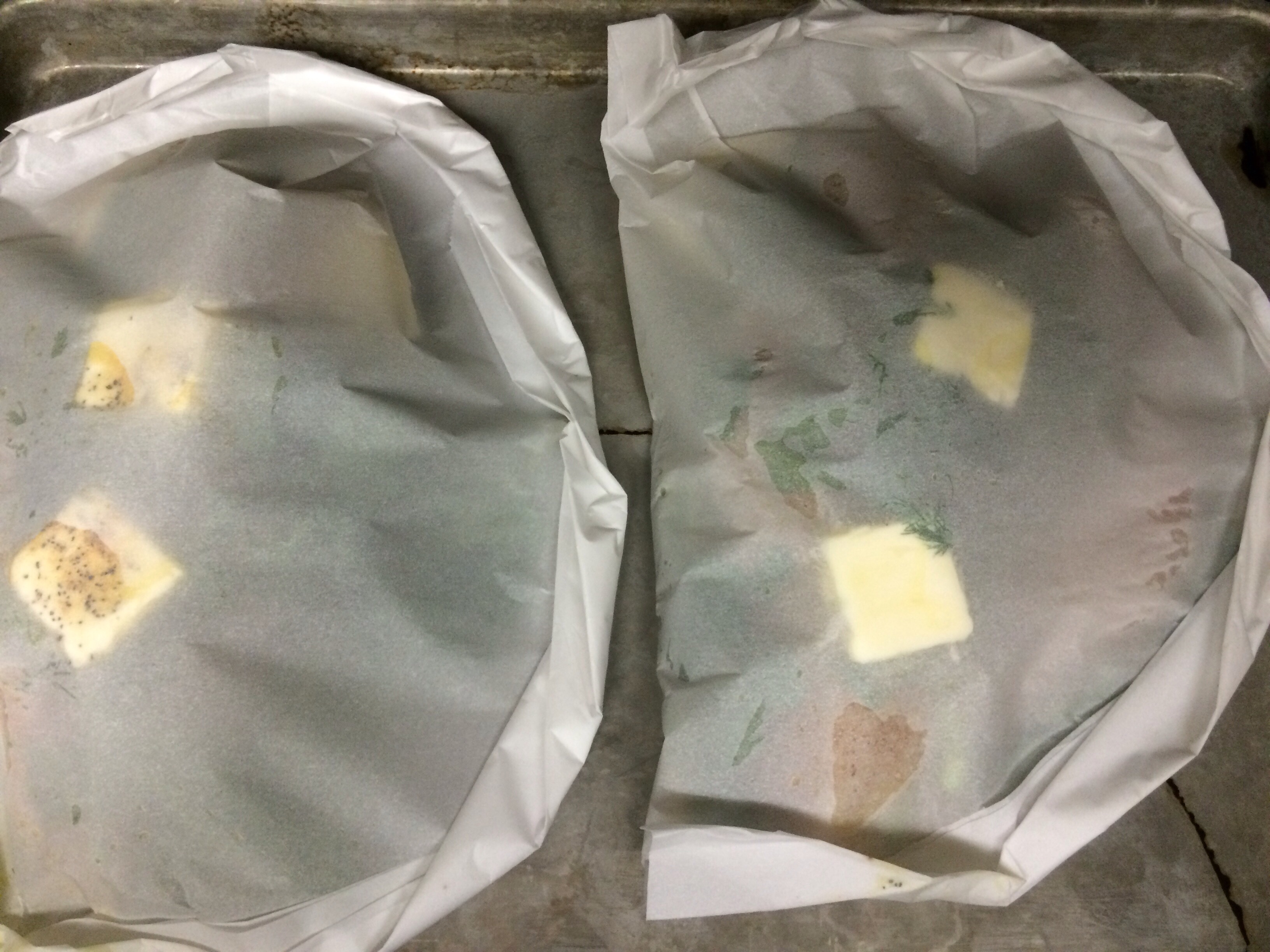 Place on cookie sheet, two at a time. Bake 25 minutes on medium rack. Remove from heat. Let rest and move parchment packages to plate. Repeat with remaining parchment packages. Open each parchment package onto a plate and serve.