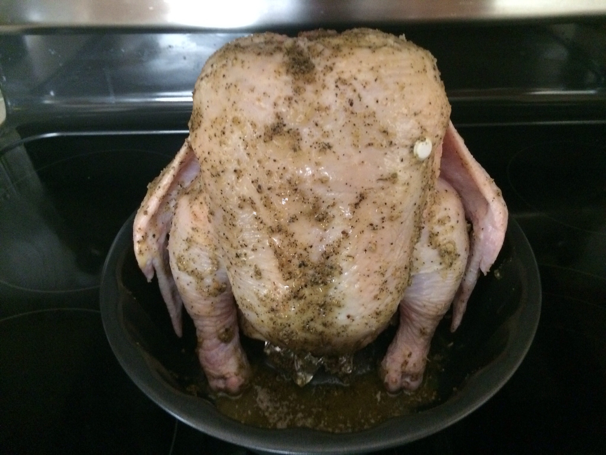 Pour chicken broth into bottom of bundt pan. Cook on low rack of oven 2-1/2 hours, basting every 30-40 minutes as needed.