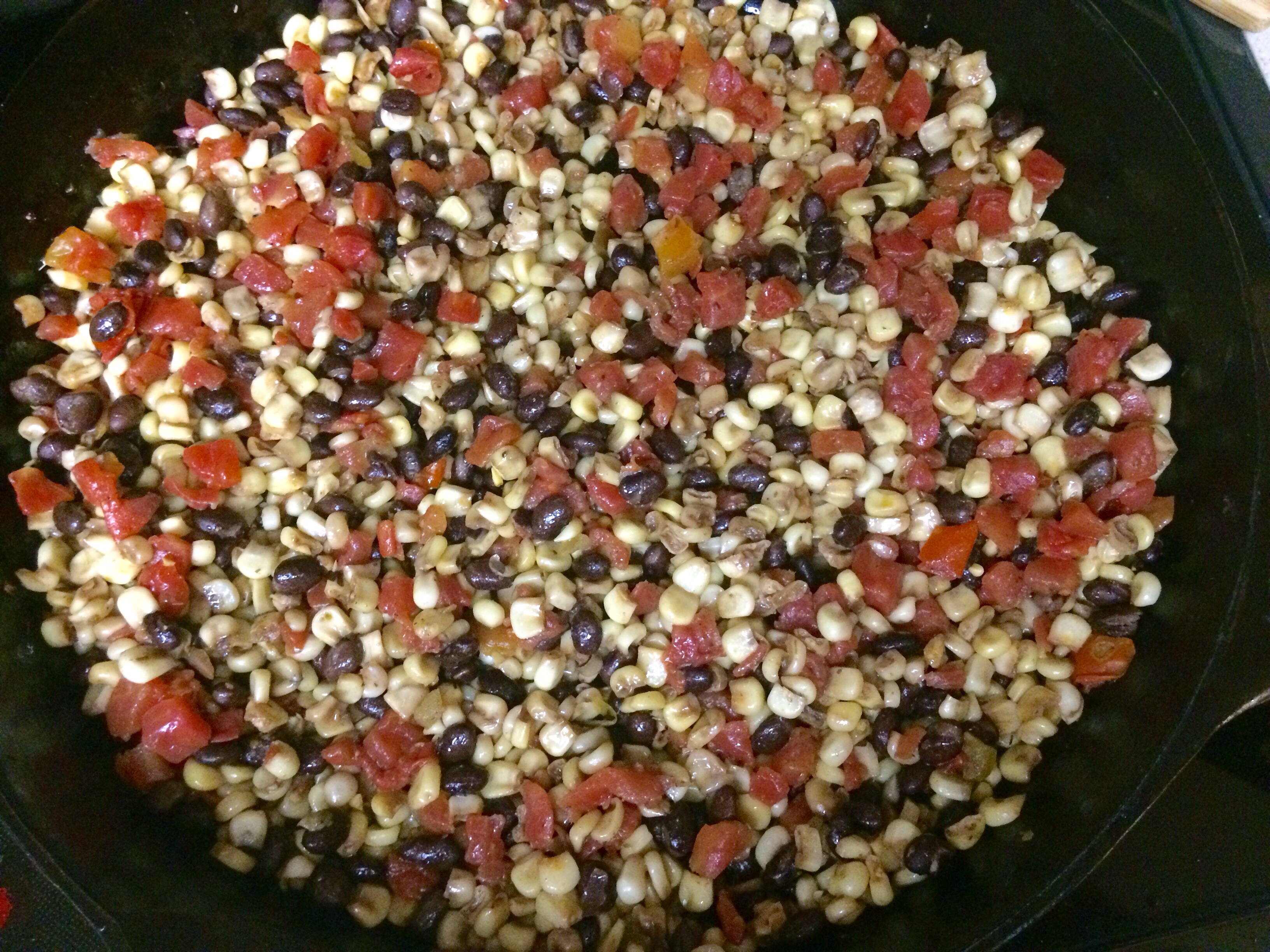 Heat oil and butter in skillet over medium heat. Turn off heat for 5 minutes, then add corn. It will sizzle, but stir well and heat burner back to medium low. Add spices, beans and tomatoes. Mix well and simmer 5-10 minutes. Turn off heat and set skillet aside.