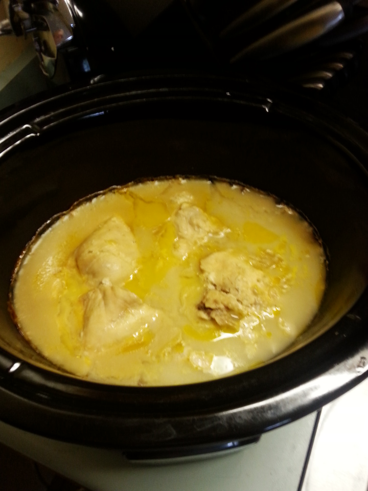 Cook in crock pot the chicken and soup all 6-8 hours on Low setting until chicken is tender and falls apart.