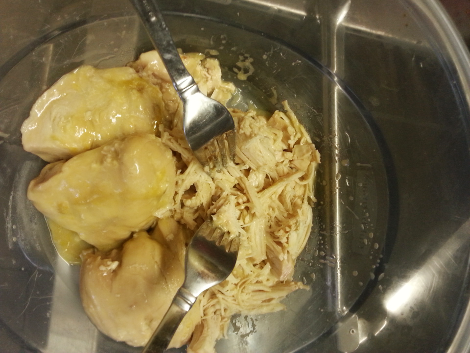 One hour before serving, pull out chicken and shred into bite-size pieces using two forks.